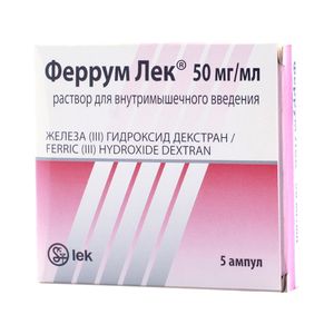 Показания к применениюЖелезодефииитные анемии (снижение содержания гемоглобина в крови вследствие нарушения поступления, усвоения или выделения железа) различной этиологии (причины).Применение при беременности и кормлении грудьюПарентеральное введение препарата противопоказано в I триместре беременности. Во II и III триместрах беременности и в период грудного вскармливания препарат назначают только в случае, если ожидаемая польза для матери превышает потенциальный риск для плода или младенца.ПротивопоказанияГемохроматоз (нарушение обмена железосодержащих пигментов) и гемосидероз (отложение темно-желтого железосодержащего пигмента в коже), а также анемии (снижение содержания гемоглобина в крови), не связанные с дефицитом железа.Побочное действиеПосле первой инъекции рекомендуется наблюдать за больными с целью выявления реакции на препарат.СоставДействующее вещество: железа (III) гидроксид полиизомальтозатКонцентрация действующего вещества (мг): 100 мгВзаимодействие с другими препаратамиФеррум Лек для в/м инъекций не следует применять одновременно с препаратами железа для приема внутрь.Одновременное применение препарата Феррум Лек с ингибиторами АПФ может вызвать усиление системных эффектов парентеральных препаратов железа.
