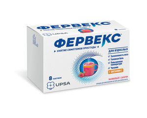 Показания к применениюИнфекционно-воспалительные заболевания (ОРВИ, грипп), сопровождающиеся высокой температурой, ознобом и лихорадкой, головной болью, насморком, заложенностью носа, чиханием и болями в мышцах.Применение при беременности и кормлении грудьюПротивопоказанПротивопоказанияПовышенная чувствительность к парацетамолу, аскорбиновой кислоте, фенирамину или любому другому компоненту препарата; эрозивно-язвенные поражения ЖКТ (в фазе обострения); почечная недостаточность; портальная гипертензия; алкоголизм; дефицит фермента глюкозо-6-фосфатдегидрогеназы; детский возраст (до 15 лет); беременность (I и III триместр) и период лактации.Побочное действиеПрепараты хорошо переносятся в рекомендованных дозах.Тошнота, боль в эпигастральной области, аллергические реакции (кожная сыпь, зуд, крапивница, отек Квинке).Редко — нарушения кроветворения (анемия, тромбоцитопения, метгемоглобинемия), сухость во рту, парез аккомодации, задержка мочи, сонливость. При длительном применении (в дозах, значительно превышающих рекомендованные) повышается вероятность нарушения функции печени и почек, необходим контроль периферической картины крови. Обо всех побочных эффектах препарата следует сообщать врачу. При появлении побочных реакций следует прекратить прием препарата и обратиться к врачу.СоставПарацетамол (Paracetamolum) 500 мг; Фенирамин (Pheniraminum) 25 мг; Аскорбиновая кислота (Acidum ascorbinicum) 200 мг. Вспомогательные вещества: сахароза; лимонная кислота безводная; камедь акации (аравийская камедь); сахаринат натрия; малиновый ароматизаторВзаимодействие с другими препаратамиЭтанол усиливает седативное действие антигистаминных препаратов.Антидепрессанты, противопаркинсонические средства, антипсихотические средства (производные фенотиазина) повышают риск развития побочных эффектов (задержка мочи, сухость во рту, запоры). ГКС увеличивают риск развития глаукомы.Индукторы микросомального окисления в печени (фенитоин, этанол, барбитураты, рифампицин, фенилбутазон, трициклические антидепрессанты) увеличивают продукцию гидроксилированных активных метаболитов, что обусловливает возможность развития тяжелых интоксикаций при небольших передозировках. Этанол способствует развитию острого панкреатита.Ингибиторы микросомального окисления (в т. ч. циметидин) снижают риск гепатотоксического действия. Парацетамол снижает эффективность урикозурических препаратов.