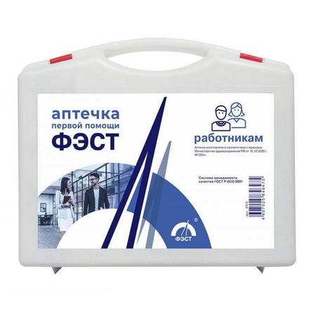 АПТЕЧКА «ФЭСТ» ДЛЯ ОКАЗАНИЯ ПЕРВОЙ ПОМОЩИ РАБОТНИКАМ артикул 2314 Соответствие приказу Аптечка изготовлена в соответствии с приказом Министерства здравоохранения РФ от 15.12.2020 г. № 1331н СОСТАВ: 1 Маска медицинская нестерильная одноразовая 10 шт. 2 Перчатки медицинские нестерильные, размером не менее М 2 пары 3 Устройство для проведения искусственного дыхания «Рот-Устройство-Рот» 1 шт. 4 Жгут кровоостанавливающий для остановки артериального кровотечения 1 шт. 5 Бинт марлевый медицинский размером не менее 5 м х 10 см 4 шт 6 Бинт марлевый медицинский размером не менее 7 м х 14 см 3 шт. 7 Салфетки марлевые медицинские стерильные размером не менее 16 х 14 см № 10 2 уп. 8 Лейкопластырь фиксирующий рулонный размером не менее 2 х 500 см 1 шт. 9 Лейкопластырь бактерицидный размером не менее 1,9 х 7,2 см 10 шт. 10 Лейкопластырь бактерицидный размером не менее 4 х 10 см 2 шт. 11 Покрывало спасательное изотермическое размером не менее 160 х 210 см 2 шт. 12 Ножницы для разрезания повязок 1 шт. 13 Инструкция по оказанию первой помощи с применением аптечки для оказания первой помощи работникам 1 шт. 14 Футляр или сумка 1 шт.