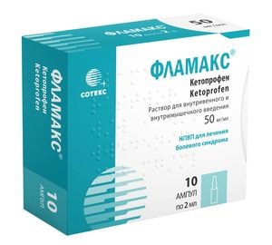 Показания к применениюСимптоматическое лечение болей и воспаления различного генеза умеренной интенсивности: воспалительные и дегенеративные заболевания опорно-двигательного аппарата — ревматоидный, псориатический, ювенильный хронический артрит, анкилозирующий спондилит (болезнь Бехтерева), подагрический артрит, ревматическое поражение мягких тканей, остеоартроз периферических суставов и позвоночника (в т.ч. и с корешковым синдромом); ;люмбаго, ишиас, невралгия; ;мигрень; ;альгодисменорея, воспалительные процессы органов малого таза, в т.ч. аднексит; ;посттравматический болевой синдром, сопровождающийся воспалением; ;послеоперационная боль; ;зубная боль; ;болевой синдром при онкологических заболеваниях.; На прогрессирование заболевания не влияет.Применение при беременности и кормлении грудьюПри одновременном применении препарата Фламакс и варфарина или препаратов лития пациенты должны находиться под строгим наблюдением врача.; Необходимо соблюдать осторожность при назначении препарата больным с язвенными заболеваниями ЖКТ в анамнезе, почечной или печеночной недостаточностью, а также получающим кумариновые антикоагулянты.; Как и остальные препараты данной группы, может маскировать симптомы инфекционных заболеваний.; Во время лечения необходим контроль картины периферической крови и функционального состояния печени и почек.; При необходимости определения 17-кетостероидов препарат следует отменить за 48 ч до исследования.; При нарушении функции печени, почек необходимо снижение дозы и тщательное наблюдение.; Для снижения риска развития нежелательных явлений со стороны ЖКТ следует использовать минимальную эффективную дозу минимально возможным коротким курсом (см. «Способ применения и дозы»).; Влияние на способность управлять транспортными средствами и работать с механизмами. В период лечения необходимо соблюдать осторожность при вождении автотранспорта и занятии другими потенциально опасными видами деятельности, требующими повышенной концентрации внимания и быстроты психомоторных реакций.СоставРаствор для внутривенного и внутримышечного введения, состав (1 амп. (2 мл)): активное вещество: кетопрофен — 100 мг; вспомогательные вещества: пропиленгликоль — 800 мг; этанол (спирт этиловый 95% в пересчете на 100% вещество) — 200 мг; бензиловый спирт — 40 мг; натрия гидроксид 1М раствор — до рН 6,5–7,5; вода для инъекций — до 2 млВзаимодействие с другими препаратамиМеры предосторожности