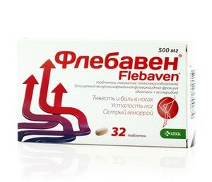 Показания к применениюТерапия симптомов венозно-лимфатической недостаточности:- Ощущение тяжести в ногах;- Боль;- ‘Усталость’ ног.Симптоматическая терапия острого геморроя.Применение при беременности и кормлении грудьюВ экспериментальных исследованиях на животных не выявлено тератогенных эффектов. До настоящего времени не было сообщений о каких-либо побочных эффектах при применении препарата беременными женщинами.Из-за отсутствия данных относительно экскреции препарата в грудное молоко, кормящим женщинам не рекомендуется прием препарата.Противопоказания- Повышенная чувствительность к действующим или к вспомогательным веществам Флебавена.Не рекомендуется прием в период грудного вскармливания.Побочное действиеСо стороны центральной нервной системы: редко: головокружение, головная боль, общее недомогание.Со стороны пищеварительной системы: часто: диарея, диспепсия, тошнота, рвота, нечасто: колит; частота неизвестна: боль в животе.Со стороны кожных покровов: редко: кожная сыпь, кожный зуд, крапивница; частота неизвестна: изолированный отек лица, губ, век.В исключительных случаях ангионевротический отек.Состав1 таблетка содержит:Активное вещество: гесперидин 5 мг, диосмин 45 мг.Взаимодействие с другими препаратамиЗначимого лекарственного взаимодействия при лечении Флебавеном совместно с другими препаратами не выявлено.