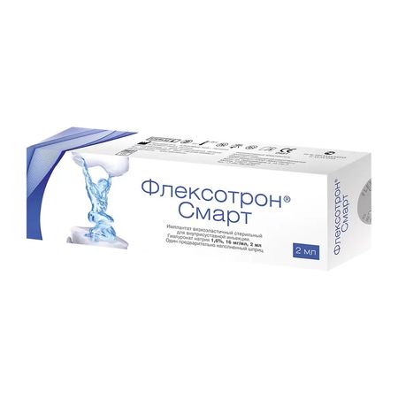 ФЛЕКСОТРОН® Смарт – протез синовиальной жидкости, стерильный, прозрачный вязкоэластичный гель, содержащий гиалуронат натрия, получаемый методом бактериальной ферментации, в фосфатном буфере. Имплантат не содержит лекарственного средства для медицинского применения, материалов животного и (или) человеческого происхождения. Показания: — остеоартрит / остеоартроз (ОА) и другие дегенеративно-дистрофические и посттравматические поражения коленных, тазобедренных и других синовиальных суставов. — восстановление свойств синовиальной жидкости при ортопедической хирургии суставов, а также у лиц, имеющих повышенные нагрузки на поврежденные суставы