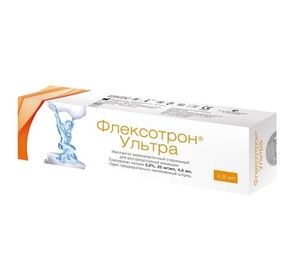 ФЛЕКСОТРОН® Ультра — протез синовиальной жидкости, стерильный, прозрачный вязкоэластичный гель, содержащий гиалуронат натрия, получаемый методом бактериальной ферментации, в фосфатном буфере.Имплантат не содержит лекарственного средства для медицинского применения, материалов животного и (или) человеческого происхождения.НазначениеВязкоэластичное протезирование синовиальной жидкости у пациентов с дегенеративно-дистрофическими и посттравматическими поражениями суставов, а также у лиц, имеющих повышенные нагрузки на поврежденные суставы.Категория пользователейИсключительно практикующие врачи-специалистами.Ведение продукта должно выполняться в асептических условиях процедурных и манипуляционных кабинетов медицинскими работниками, владеющими техникой интраартикулярных инъекций.Объем одного имплантата приближен к безопасному объему для коленного сустава взрослого человека. Нет каких-либо ограничений по антропометрическим и анатомическим особенностям целевого пациента.Свойства и принцип действияГиалуроновая кислота представляет собой поли-(2-ацетамидо-2-дезокси-D-глюко)-D-глюкуроногликан, то есть полимер, состоящий из остатков D-глюкуроновой кислоты и N-ацетил-D-глюкозамина, соединённых поочерёдно ?-1,4- и ?-1,3-гликозидными связями. Благодаря такой полимерной трехмерной структуре формируются крупные отрицательно заряженные агрегаты, удерживающие воду. Эти агрегаты отвечают за влагосодержание, упругость и эластичность хрящевой ткани (устойчивость её к компрессии).Внутрисуставное обогащение синовиальной жидкости инъекциями гиалуроната натрия способствует улучшению или восстановлению вязкоупругих свойств естественной синовиальной жидкости. Гиалуронат натрия отвечает за вязкоупругие свойства синовиальной жидкости, таким образом вязкоэластичное протезирование позволяет компенсировать недостаточность гиалуроновой кислоты в синовиальной жидкости или снижение её вязкости, смягчить внешние нагрузки на сустав, обеспечивает смазывание, восстановление упругости и вязкости, амортизацию, увлажнение и обволакивание суставных поверхностей, покрывая смазывающим защитным слоем хрящ и рецепторы синовии. Это помогает увеличить объём движений и обеспечивает механическую защиту тканей полости сустава, что в свою очередь может улучшать течение остеоратроза / остеоартрита и других дегенеративно-дистрофических и посттравматических патологий суставов.На основании клинических сведений об особенностях биодеградации и продолжительности лечебных эффектов внутрисуставного введения гиалуроновой кислоты предполагается, что биодеградация вязкоэластичного имплантата "ФЛЕКСОТРОН®" происходит в срок от 12 до 24 недель. Клинический эффект лечения сохраняется в течение не менее 6 месяцев.