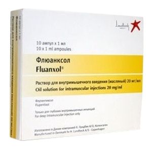 Показания к применениюДля приема внутрь в дозе до 3 мг/сут — депрессия легкой и средней степени с тревогой, астенией и отсутствием инициативы — хронические невротические расстройства с тревогой, депрессией и апатией — психосоматические нарушения с астеническими реакциями. Для приема внутрь в дозе 3 мг/сут и более — шизофрения и шизофреноподобные психозы с преобладанием галлюцинаторной симптоматики, бреда, нарушений мышления, сопровождающиеся также апатией, анергией, снижением настроения и аутизмом. Для в/м введения — шизофрения и другие психотические состояния, протекающие с галлюцинациями, бредом и нарушениями мышления, сопровождающиеся апатией, анергией, снижением настроения и аутизмом.Применение при беременности и кормлении грудьюПрименение Флюанксола при беременности и в период лактации (грудного вскармливания) возможно только в случаях, если предполагаемая польза терапии для матери превышает потенциальный риск для плода. У новорожденных, чьи матери принимали нейролептики в III триместре беременности или во время родов, могут наблюдаться признаки интоксикации, такие как летаргия, тремор, чрезмерная возбудимость. Кроме того, у таких новорожденных отмечается низкий балл по шкале Апгар. Во время лечения Флюанксолом допускается грудное вскармливание, если это признано клинически необходимым. В таких случаях рекомендуется наблюдать за состоянием новорожденного, особенно в первые 4 недели после рождения.Состав1 мл цис(Z)-флупентиксола деканоат 20 мг. Вспомогательные вещества: триглицериды с цепями средней величины.