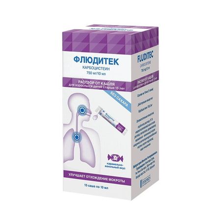 Показания Острые и хронические бронхолегочные заболевания и заболевания ЛОР-органов, сопровождающиеся образованием вязкой, трудноотделяемой мокроты (трахеит, бронхит, трахеобронхит, бронхиальная астма, бронхоэктатическая болезнь) и слизи (воспалительные заболевания среднего уха, носа и его придаточных пазух — ринит, средний отит, синусит); подготовка пациента к бронхоскопии или бронхографии. Фармакологическое действие Муколитическое средство. Действие обусловлено активацией сиаловой трансферазы — фермента бокаловидных клеток слизистой оболочки бронхов. Нормализирует количественное соотношение кислых и нейтральных сиаломуцинов бронхиального секрета. Снижает вязкость бронхиального секрета и отделяемого из придаточных пазух носа, облегчает отхождение мокроты и слизи, уменьшает кашель. Способствует регенерации слизистой оболочки, нормализует ее структуру, активизирует деятельность реснитчатого эпителия. Восстанавливает секрецию иммуноглобулина IgA (специфическая защита) и количество сульфгидрильных групп компонентов слизи (неспецифическая защита), улучшает мукоцилиарный клиренс. Лекарственное взаимодействие Карбоцистеин повышает эффективность терапии ГКС и антибактериальными препаратами при лечении инфекционно-воспалительных заболеваний верхних и нижних дыхательных путей. Карбоцистеин потенцирует бронхолитический эффект теофиллина. Действие карбоцистеина ослабляют противокашлевые и м-холиноблокирующие средства.