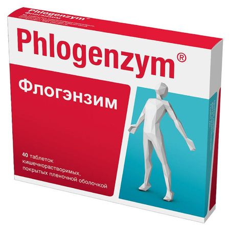 Показания В составе комплексной терапии и для профилактики следующих заболеваний: Хирургия послеоперационное восстановление и реабилитация больных (улучшение репаративных процессов и регенерации); послеоперационные гнойно-воспалительные осложнения; предупреждение развития спаечной болезни и образования келоидного рубца; снижение риска тромбоэмболических осложнений при длительной иммобилизации. Травматология переломы костей; повреждения сухожилий и связок; ушибы и гематомы мягких тканей; спортивные травмы; ожоги; улучшение интеграции эндопротезов; остеосинтез. Ангиология тромбофлебиты поверхностных вен; посттромботическая болезнь; облитерирующий атеросклероз артерий нижних конечностей и другие хронические ангиопатии; нарушения микроциркуляции; лимфатические отеки (лимфедема). Урология острые и хронические воспаления мочеполового тракта (цистит, уретрит, простатит). Гинекология сосудистые осложнения климактерического периода; снижение частоты и выраженности осложнений заместительной гормональной терапии. Кардиология ИБС; снижение риска сосудистых катастроф и повторных инфарктов. Гастроэнтерология гепатиты. Ревматология ревматоидный артрит; анкилозирующий спондилоартрит; реактивный артрит; ревматическое поражение мягких тканей. Неврология ишемический инсульт; рассеянный склероз. Пульмонология хроническая обструктивная болезнь легких. Стоматология предупреждение осложнений в послеоперационном периоде при экстракции зубов; гнойно-воспалительные заболевания челюстно-лицевой области; реабилитация и восстановление после хирургических вмешательств на челюстно-лицевой области; улучшение интеграции имплантатов; остеосинтез. Фармакологическое действие Флогэнзим представляет собой лекарственный препарат нового поколения, состоящий из комбинации высокоактивных протеолитических энзимов (ферментов) растительного и животного происхождения — бромелаина и трипсина, в сочетании с рутином. В комбинации энзимы оказывают плейотропное (множественное) действие, обладая разнообразными фармакологическими действиями на патофизиологические и биохимические процессы. Энзимы препарата реализуют свои лечебные эффекты через противовоспалительное, иммуномодулирующее, антиагрегантное, фибринолитическое, тромболитическое, противоотечное и вторичное анальгезирующее действия. Кишечнорастворимые таблетки препарата, покрытые пленочной оболочкой, транзитом проходят верхние отделы ЖКТ, не травмируя желудок, всасываются из тонкого кишечника путем резорбции интактных молекул (эндоцитоз, пиноцитоз). Протеазы препарата, связываясь с транспортными белками крови (альфа-2-макроглобулин и альфа-1-антитрипсин), образуют обратимый комплекс протеаза-антипротеаза, в котором замаскированы антигенные детерминанты экзогенных протеаз препарата, что предотвращает аллергические реакции. В результате образования комплекса с энзимами антипротеаза (альфа-2-макроглобулин) переходит в активную форму, которая выполняет функцию внеклеточного регулятора провоспалительных цитокинов и факторов роста, осуществляя их перенос, клиренс и элиминацию. Образование активного комплекса протеаза-антипротеаза позволяет безопасно перемещать протеолитические энзимы по сосудистому руслу к очагу воспаления и к месту травмы, независ