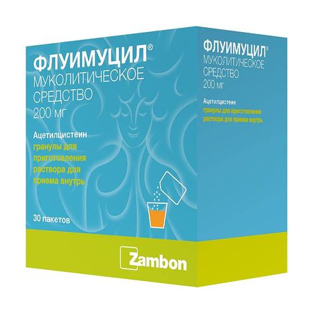 Показания заболевания органов дыхания, сопровождающиеся нарушением отхождения мокроты (в т.ч. бронхит, трахеит, бронхиолит, пневмония, бронхоэктатическая болезнь, муковисцидоз, абсцесс легкого, эмфизема легких, ларинготрахеит, интерстициальные заболевания легких, ателектаз легкого /вследствие закупорки бронхов слизистой пробкой/); катаральный и гнойный отит, синусит, в т.ч. гайморит (для облегчения отхождения секрета); для удаления вязкого секрета из дыхательных путей при посттравматических и послеоперационных состояниях. Фармакологическое действие Разжижает мокроту, увеличивает ее объем и облегчает ее отделение. Действие ацетилцистеина связано со способностью его сульфгидрильных групп разрывать внутри- и межмолекулярные дисульфидные связи кислых мукополисахаридов мокроты, что приводит к деполяризации мукопротеидов и уменьшению вязкости мокроты. Сохраняет активность при наличии гнойной мокроты. Увеличивает секрецию менее вязких сиаломуцинов бокаловидными клетками, снижает адгезию бактерий на эпителиальных клетках слизистой оболочки бронхов. Стимулирует мукозные клетки бронхов, секрет которых лизирует фибрин. Аналогичное действие оказывает на секрет, образующийся при воспалительных заболеваниях ЛОР-органов. Оказывает антиоксидантное действие, обусловленное наличием SH-группы, способной нейтрализовать электрофильные окислительные токсины. Ацетилцистеин легко проникает внутрь клетки, деацетилируется до L-цистеина, из которого синтезируется внутриклеточный глутатион. Глутатион — высокореактивный трипептид, мощный антиоксидант и цитопротектор, нейтрализующим эндогенные и экзогенные свободные радикалы и токсины. Ацетилцистеин предупреждает истощение и способствует повышению синтеза внутриклеточного глутатиона, участвующего в окислительно-восстановительных процессах клеток, способствуя детоксикации вредных веществ. Этим объясняется действие ацетилцистеина в качестве антидота при отравлении парацетамолом. Предохраняет α1-антитрипсин (ингибитор эластазы) от инактивирующего воздействия HOCI — окислителя, вырабатываемого миелопероксидазой активных фагоцитов. Обладает также противовоспалительным действием (за счет подавления образования свободных радикалов и активных кислородсодержащих веществ, ответственных за развитие воспаления в легочной ткани). Фармакокинетика Всасывание При приеме внутрь хорошо абсорбируется из ЖКТ. После приема внутрь Cmax в плазме достигается через 1-3 ч и составляет 15 ммоль/л. Биодоступность составляет 10% из-за выраженного эффекта «первого прохождения» через печень. Распределение Проникает в межклеточное пространство, преимущественно распределяется в печени, почках, легких, бронхиальном секрете. Проникает через плацентарный барьер. Связывание с белками плазмы крови — 50%. Метаболизм Быстро деацетилируется до цистеина в печени. В плазме наблюдается подвижное равновесие свободного и связанного с белками плазмы ацетилцистеина и его метаболитов (цистеина, цистина, диацетилцистина). Выведение T1/2 при приеме внутрь составляет 1 ч, при циррозе печени увеличивается до 8 ч. Выводится с мочой в виде неактивных метаболитов (неорганические сульфаты, диацетилцистеин), незначительная часть выводится в неизмененном виде через кишечник. Лекарственное взаимодействие Одновреме