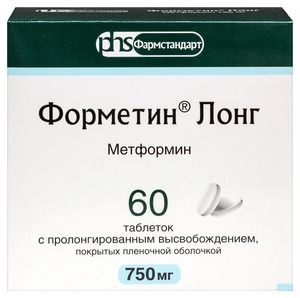 Показания к применениюСахарный диабет 2 типа у взрослых, особенно у пациентов с ожирением, при неэффективности диетотерапии и физических нагрузок:- в качестве монотерапии;- в сочетании с другими пероральными гипогликемическими средствами или с инсулином.Побочное действиеЧастота побочных эффектов препарата расценивается следующим образом:Очень частые: ≥ 1/10.Частые: ≥ 1/100, < 1/10.Нечастые: ≥ 1/1000, < 1/100.Редкие: ≥ 1/10 000, < 1/1000.Очень редкие: <1/10 000.Нарушения со стороны обмена веществ и питания:Очень редко: лактоацидоз (см. "Особые указания").При длительном приеме метформина может наблюдаться снижение всасывания витамина В12. При обнаружении мегалобластной анемии необходимо учитывать возможность такой этиологии.Нарушения со стороны нервной системы:Часто: нарушение вкуса (металлический привкус во рту).Нарушения со стороны желудочно-кишечного тракта:Очень часто: тошнота, рвота, диарея, боли в животе и отсутствие аппетита.Наиболее часто они возникают в начальный период лечения и в большинстве случаев спонтанно проходят. Для предотвращения симптомов рекомендуется принимать метформин во время приема пищи. Медленное увеличение дозы может улучшить желудочно-кишечную переносимость.Нарушения со стороны печени и желчевыводящих путей:Очень редко: нарушение показателей функции печени и гепатит; после отмены метформина эти нежелательные явления полностью исчезают.Нарушения со стороны кожи и подкожных тканей:Очень редко: кожные реакции, такие как эритема (покраснение кожи), зуд, крапивница.Если любые из указанных в инструкции побочных эффектов усугубляются, или были замечены любые другие побочные эффекты, не указанные в инструкции, необходимо сообщить об этом врачу.СоставНа одну таблетку:Действующее вещество: метформина гидрохлорид — 750,00 мгВспомогательные вещества: гипромеллоза (гидроксипропилметилцеллюлоза 200000 сПз) — 330,00 мг, гипролоза гидроксипропилцеллюлоза) — 60,00 мг,; магния стеарат — , 6,00 мг; кремния диоксид коллоидный (аэросил) — 6,00 мг,лактозы моногидрат — 48,00 мг.Оболочка: VIVACOAT® РА-1Р-000 [гипромеллоза (гидроксипропилметилцеллюлоза 6 сПз) — 14,04 мг; титана диоксид — 10,80 мг, полидекстроза — , 5,40 мг; тальк — 3,60 мг, полиэтиленгликоль 3350 (макрогол-3350) — 2,16 мг,] — 36,00 мг.