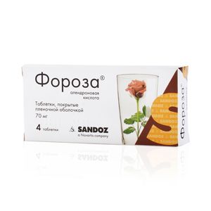 Показания к применениюЛечение остеопороза у женщин в постменопаузе, в т.ч. для снижения риска компрессионных переломов позвоночника и переломов шейки бедра . — лечение остеопороза у мужчин с целью предупреждения переломов . — лечение остеопороза, вызванного длительным применением ГКС.Применение при беременности и кормлении грудьюПротивопоказано применение при беременности и в период лактации (грудного вскармливания).ПротивопоказанияСтриктуры или ахалазии пищевода и другие состояния, приводящие к замедлению продвижения пищи по пищеводу . — неспособность пациента стоять или сидеть на протяжении 30 мин . — гипокальциемия . — почечная недостаточность тяжелой степени (КК менее 35 мл/мин) . — тяжелые нарушения минерального обмена . — беременность . — период лактации (грудного вскармливания) . — детский возраст (эффективность и безопасность применения не установлены) . — повышенная чувствительность к алендронату или другим компонентам препарата. С осторожностью следует назначать препарат пациентам с заболеваниями ЖКТ (дисфагия, гастрит, дуоденит, язвенная болезнь в стадии обострения, активное желудочно-кишечное кровотечение или хирургическая операция на верхних отделах ЖКТ в анамнезе), гиповитаминоз D. Применение при нарушениях функции почек Для пациентов с умеренным нарушением функции почек (КК более 35 мл/мин) коррекции дозы не требуется. При КК менее 35 мл/мин применение препарата противопоказано. Применение у пожилых пациентов Для пожилых пациентов коррекции дозы не требуетсяПобочное действиеПри приме таблеток Фороза могут наблюдаться следующие Побочное реакции: абдоминальные боли . жидкий стул или запор . вздутие живота . нарушение глотания . изжога . воспаление слизистой желудка . тошнота и рвота . стеноз и перфорация пищевода . язвы на слизистых ЖКТ . эзофагит . кровотечение из верхних участков пищеварительного тракта . дегтеобразный стул . головные боли . головокружение . изменение вкуса . раздражительность . склерит . увеит . конъюнктивит . кожная аллергия . выпадение волос . фоточувствительность . миалгия . боль в костях . артралгия . остеонекроз челюсти . атипичные переломы бедра . отечность суставов . понижение уровня кальция и фосфора в кровиСоставАлендроната натрия тригидрат 91.35 мг, что соответствует содержанию алендроновой кислоты 70 мг Вспомогательные вещества: целлюлоза микрокристаллическая, кремния диоксид коллоидный безводный, кроскармеллоза натрия, магния стеарат. Состав оболочки: Lustre Clear LC 103 (целлюлоза микрокристаллическая, каррагинан, макрогол 8000).