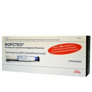 Показания к применению остеопороз у женщин в постменопаузальном периоде; первичный остеопороз или остеопороз, обусловленный гипогонадизмом, у мужчин; остеопороз с повышенным риском переломов, обусловленный длительной системной терапией ГКС, у мужчин и женщин.Противопоказания Повышенная чувствительность к терипаратиду или вспомогательным веществам препарата; предшествующая гиперкальциемия; тяжелая почечная недостаточность; метаболические заболевания костей (включая гиперпаратиреоз и болезнь Педжета), за исключением первичного остеопороза и остеопороза, обусловленного длительной системной терапией ГКС; повышение активности ЩФ неясного генеза; предшествующая лучевая терапия костей скелета; метастазы в кости или опухоли костей в анамнезе; беременность; лактация; возраст до 18 лет.