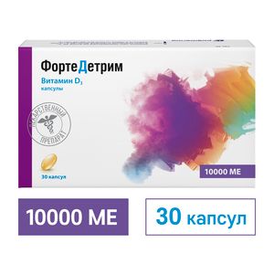Показания к применениюЛечение и профилактика дефицита и недостаточности витамина D и состояний, вызванных дефицитом витамина D у взрослых.Применение при беременности и кормлении грудьюПрименение препарата Фортедетрим в период беременности и грудного вскармливания не рекомендуется в данных дозировках в связи с превышением рекомендуемой суточной дозой 1000 МЕ. Во время беременности и в период грудного вскармливания рекомендуется применение препаратов колекальциферола в более низких дозах, например, Аквадетрим.ПротивопоказанияПовышенная чувствительность к действующему веществу или любому из вспомогательных веществ, перечисленных в разделе «Состав»;Гиперкальциемия и (или) гиперкальциурия;Мочекаменная болезнь (образование кальциевых оксалатных камней);Гипервитаминоз D;Псевдогипопаратиреоз;Саркоидоз;Активная форма туберкулеза легких;Тяжелая почечная недостаточность;Беременность и период грудного вскармливания (в данных дозировках);Детский возраст до 18 лет.С осторожностьюПрием дополнительных количеств колекальциферола и кальция (например, в составе других препаратов), при нарушениях экскреции кальция и фосфатов с мочой, при лечении иммобилизованных пациентов, при одновременном приеме тиазидов, сердечных гликозидов (особенно гликозидов наперстянки), производных бензотиадиазина, у пациентов с атеросклерозом.Побочное действиеКлассификация частоты нежелательных реакций: нечасто (≥1/1000 –Нарушения со стороны иммунной системы: Неизвестно — Реакции гиперчувствительности, такие как ангионевротический отек или отек гортани.Нарушения со стороны обмена веществ и питания: Нечасто — Гиперкальциемия или гиперкальциурия.Нарушения со стороны желудочно-кишечного тракта: Неизвестно — Запор, вздутие живота, тошнота, абдоминальная боль, диарея.Нарушения со стороны кожи и подкожной клетчатки: Редко — Зуд, сыпь, крапивница.СоставНа 1 капсулу:действующее вещество: колекальциферол 10000 МЕ (0,25 мг);вспомогательные вещества: сафлоровое масло рафинированное;капсула: желатин, глицерол, вода очищенная.