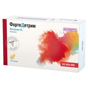 Препарат Фортедетрим содержит действующее вещество колекальциферол. Препарат Фортедетрим относится к группе витаминов, содержит активную форму витамина D.Внешний вид препарата Фортедетрим и содержимое упаковки:Прозрачные, овальные, мягкие желатиновые капсулы желтоватого цвета со швом посередине. Содержимое капсул: прозрачная бесцветная маслянистая жидкость.