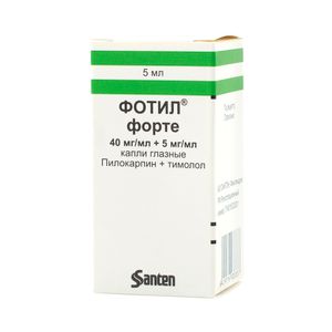 Показания к применениюГлаукома или повышенное внутриглазное давление, когда необходима комбинация тимолола и пилокарпина: — открытоугольная глаукома, ,— закрытоугольная глаукома, ,— вторичная глаукома, — повышение внутриглазного давления после офтальмологических операций,Применение при беременности и кормлении грудьюПрименение препарата Фотил форте при беременности и в период грудного вскармливания возможно только в том случае, когда предполагаемая польза для матери превышает потенциальный риск для плода,ПротивопоказанияПовышенная чувствительность к любому из компонентов препарата, острый ирит, синусовая брадикардия, AV блокада II и III степени, сердечная недостаточность в стадии декомпенсации, кардиогенный шок, бронхиальная астма, хронические обструктивные заболевания легких в тяжелой форме. С осторожностью применять при цереброваскулярных расстройствах, сердечной недостаточности, бронхиальной астме, сахарном диабете и гипогликемии, тиреотоксикозе, перед операциями с применением общей анестезии,Побочное действиеМестные: быстро проходящее чувство жжения и боль в глазу, усиленное слезотечение, покраснение конъюнктивы, височные и супраорбитальные головные боли, близорукость, связанные с тимололом: снижение чувствительности роговицы, точечный кератит, синдром «сухого глаза», дерматит век, возможны: спазм цилиарной мышцы, индуцированная миопия, снижение остроты зрения при недостаточном освещении (вследствие миоза). Системные: тошнота, диарея, усиленное потоотделение, увеличенное слюноотделение, снижение АД, астматический приступ, сердечная недостаточность, аритмия.Состав1 мл содержит: Действующие вещества: Пилокарпина гидрохлорид 40,0 мг, тимололу малеат 6,84 мг (экв. тимолу 5,0 мг) Вспомогательный вещества: Бензалкония хлорид 0,10 мг, лимонная кислота 0,88 мг, натрия цитрат 6,13 мг, гипромеллоза 5,0, вода для инъекций до 1 мл.Взаимодействие с другими препаратамиПри одновременном применении Фотила форте с препаратами, способствующими высвобождению катехоламинов (например, с резерпином), в единичных случаях наблюдались артериальная гипотензия (в т.ч. ортостатическая), брадикардия, головокружение. Одновременное применение бета-адреноблокаторов и блокаторов медленных кальциевых каналов системного действия приводит к усилению их фармакологического эффекта и повышает риск развития нарушений сердечной проводимости и артериальной гипотензии. Ингибиторы изофермента CYP2D6, такие как хинидин и циметидин, могут увеличить концентрацию тимолола в плазме,