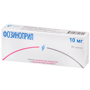 Показания к применениюАртериальная гипертензия, ХСН.ПротивопоказанияГиперчувствительность к фозиноприлу, беременность, период лактации.С осторожностью. Ангионевротический отек в анамнезе на фоне терапии ингибиторами АПФ, наследственный или идиопатический ангионевротический отек, аортальный стеноз, церебро- и кардиоваскулярные заболевания (в т.ч. недостаточность мозгового кровообращения, ИБС, коронарная недостаточность), тяжелые аутоиммунные системные заболевания соединительной ткани (в т.ч. СКВ, склеродермия), угнетение костномозгового кроветворения, сахарный диабет, гиперкалиемия, двусторонний стеноз почечных артерий, стеноз артерии единственной почки, состояние после трансплантации почек, печеночная недостаточность, диета с ограничением Na+, состояния, сопровождающиеся снижением ОЦК (в т.ч. диарея, рвота), пожилой возраст, возраст до 18 лет (безопасность и эффективность применения не изучены).Побочное действиеСо стороны ССС: снижение АД, ортостатический коллапс, тахикардия, сердцебиение, аритмии, стенокардия, инфаркт миокарда.Со стороны мочевыделительной системы: развитие или усиление ХПН, протеинурия.Со стороны нервной системы: инсульт, ишемия головного мозга, головокружение, головная боль, слабость; при использовании в высоких дозах — бессонница, тревожность, депрессия, спутанность сознания, нарушения вестибулярного аппарата, парестезии.Со стороны органов чувств: нарушения слуха и зрения, шум в ушах.Со стороны пищеварительной системы: тошнота, кишечная непроходимость, панкреатит, гепатит, холестатическая желтуха, боль в животе, рвота, диспепсия, запор, снижение аппетита, стоматит, глоссит.Со стороны дыхательной системы: сухой кашель, легочные инфильтраты, бронхоспазм, одышка, ринорея, фарингит, дисфония.Аллергические, токсико-аллергические и иммунопатологические реакции, в т.ч. ангионевротический отек тонкой кишки (очень редко).Лабораторные показатели: гиперкреатининемия, повышение концентрации мочевины, повышение активности "печеночных" трансаминаз, гипербилирубинемия, гиперкалиемия, гипонатриемия; снижение Hb и гематокрита, нейтропения, лейкопения, эозинофилия, повышение СОЭ. Сообщалось о случаях развития гипогликемии у пациентов с сахарным диабетом, которые принимали инсулин и пероральные гипогликемические ЛС.Тератогенное, фетотоксическое действие — нарушение развития почек плода, снижение АД плода и новорожденных, нарушение функции почек, гиперкалиемия, гипоплазия черепа, олигогидрамнион, контрактура конечностей, деформация черепа, гипоплазия легких.СоставФозиноприл 10 мг.