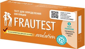 Frautest Ovulation Тест-полоска на овуляцию .Особенности:Быстрый результат. Четкий результат в течение 3-5 минутДиагностика зачатия. Тест выявляет благоприятные дни, когда вероятность зачатия самая высокая.Достоверность более 99.9%. Немецкое качество и высокая чувствительность теста обеспечивают более точное исследование чем календарный и температурный методы.Дополнительные удобства. Пять емкостей для сбора мочи уже находятся в упаковке.Принцип действия:Овуляция — это процесс выхода созревшей, готовой к оплодотворению яйцеклетки из яичников в брюшную полость. При регулярном менструальном цикле овуляция происходит ежемесячно примерно в середине цикла. Тест на овуляцию определяет повышение содержания лютеинизирующего гормона (ЛГ) в моче. ЛГ — это гормон фертильности — содержится в моче каждой здоровой женщины, чувствительность тестов позволяет выявлять его в концентрации от 25 мМЕ/мл. Количество гормона резко возрастает за 24-48 часов до овуляции. Наиболее благоприятными для зачатия считаются два дня после пикового выброса ЛГ. Период, когда можно забеременеть, довольно короток, поскольку продолжительность жизни яйцеклетки около 24 часов, а сперматозоиды остаются способными к оплодотворению в течение 72 часов. Когда следует проводить тестирование? Для большинства женщин с постоянным менструальным циклом достаточно всего 5 дней. Чтобы определить день начала тестирования, следует от числа дней полного цикла отнять 17. Например, если Ваш цикл составляет 28 дней, то тестирование следует начать на 11-ый день (28 — 17 = 11). Для определения дня начала тестирования используйте данную таблицу. В случае непостоянного цикла выберите для отсчета наиболее короткий цикл. Если в течение 5 дней повышение гормона ЛГ не произошло, необходимо продолжить тестирование еще несколько дней.Тест можно использовать только один разFrautest Ovulation — Набор из 5 тест-полосок. Тест представляет собой пропитанную реагентом (мечеными антителами к ЛГ) бумажную полоску, которую на 10 секунд погружают в емкость с мочой. Смотрите и пробуйте Frautest Express — Тест-полоску.