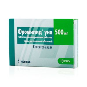 Показания к применениюФармакокинетикаПротивопоказанияИнфекционно-воспалительные заболевания, вызванные чувствительными к препарату микроорганизмами: — инфекции верхних дыхательных путей и ЛОР-органов (тонзиллит, фарингит, синусит, острый средний отит) . — инфекции нижних дыхательных путей (бронхит, внебольничная пневмония) . — инфекции кожи и мягких тканей (в т.ч. фолликулит, рожа).Побочное действиеПрепарат принимают внутрь, во время еды. Таблетки следует проглатывать целиком, не разламывая и не разжевывая. Взрослым назначают в дозе 500 мг (1 таб.) 1 раз/сут. При тяжелых инфекциях: 1000 мг (2 таб.) 1 раз/сут. Курс лечения составляет 5-14 дней, при внебольничной пневмонии и синусите — 6-14 дней. У пациентов пожилого возраста нет необходимости изменять дозу кларитромицина, кроме случаев выраженных нарушений функции почек. Не следует применять Фромилид уно при КК меньше 30 мл/мин. У пациентов с печеночной недостаточностью коррекция дозы не требуется.Состав1 таб. кларитромицин 500 мг.