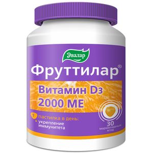 Фруттилар Витамин D3 2000 ME. Удобство приема – всего 1 вкусная пастилка в день с витамином D3 2000 МЕАктивное вещество: холекальциферол (витамин D3).Действие: для укрепления иммунитета, лучшего усвоения кальция, повышения силы мышц, поддержания сердечно-сосудистой и нервной систем.Фруттилар Витамин D3— для тех, кто хочет не только получать от витамина D3 пользу, но и порадовать себя приятным вкусом. Он отличается уникальной формой выпуска — мармеладные ягоды. Без глютена, без лактозы, без ГМО. В изготовлении мармеладной основы используются натуральные пищевые компоненты: сахар, желатин (источник коллагена) и патока. Не требуют запивания.Фруттилар Витамин D3 способствует: Укреплению иммунитета и снижению риска развития простудных заболеваний Лучшему усвоению кальция, укреплению костей, зубов, снижению риска развития остеопороза Повышению силы мышц Поддержанию сердечно-сосудистой и нервной систем, регуляции репродуктивной функции организма, повышению уровня серотонина – «гормона счастья» и улучшению настроения. За последние несколько лет во всем мире выросла популярность витамина D3. По данным ВОЗ 80% россиян испытывает дефицит витамина D3. Он очень важен для нашего здоровья, так как повышает иммунитет, снижает уровень воспаления и вирусной активности, а также участвует еще в двухстах функциях организма.Прием витамина D3 способствует снижению заболеваемости ОРВИ, в том числе новой коронавирусной инфекции COVID-19. Доказано, что в странах, где у пациентов с COVID-19 более высокое содержание в организме витамина D3, риск осложнений значительно ниже. Витамин D3 повышает защитные силы организма, снижает уровень «цитокинового шторма» (гипервоспаления), поддерживает функцию легких.Влияние витамина D3 на иммунную систему • Прием витамина D3 снижает риск развития ОРЗ в среднем на 12%, • Витамин D3 лучше принимать ежедневно, а не однократно (риск развития ОРЗ снижается на 19%), • Защитный эффект более выражен у людей с исходно низким уровнем витамина D3 в крови (риск снижается на 70%), • Витамин D3 положительно влияет на работу легких, способствуя улучшению дыхательной функции, • У больных с пневмонией, а также на искусственной вентиляции легких, чаще встречается недостаточность витамина D3.