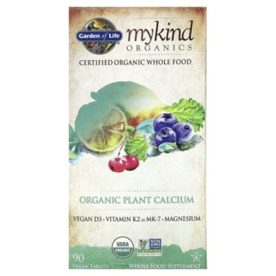 Сертифицированные органические цельные продуктыВеганский витамин D3 • Витамин K2 в виде менахинона-7 • Магний Сертификат USDA Organic Сертификат Non-GMO Project Verified Цельнопищевая добавка Кошерный продукт Содержит Vitashine D3 Органический состав сертифицирован организацией QCS Цельные продукты, полученные с органических фермНе содержит стеарата магния (растительной смазки)Кальций растительного происхождения и витамины D3 и K2 в виде менахинона-7 с более чем 20 органическими продуктами, выращенными на семейных фермах. Сертифицированный органический составВсе ингредиенты выращиваются без использования токсичных пестицидов и удобренийСертификат Non GMO VerifiedНезависимая внешняя сертификацияБез глютена, сертификат Certified Gluten-Free Отсутствие глютена в составе подтверждено сертификатом GFCO в независимой лаборатории Сертифицированный веганский продукт Внешняя сертификация проведена организацией Vegan Action Состав с сертифицированным органическим растительным кальцием, включающий веганский витамин D3 и витамин К в форме менахинона-7. Снижает риск развития остеопороза.††Прочность костейРастительный кальций и поддерживающий прочность костей витамин D3 из лишайника и витамин K2 в виде менахинона-7 Комфортен для пищерваренияЛегкоусвояемый кальций: не из измельченных камней, а из растений Формула на основе натуральных продуктовИзготовлен из более чем 20 видов измельченных фруктов и овощей †† Достаточное количество кальция и витамина D в здоровом рационе, наряду с физической активностью, может снизить риск развития остеопороза с возрастом.