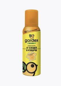 «Gardex Baby» — аэрозоль от клещей и комаров для обработки одежды, выпускается в упаковке 150 мл. Средство подходит для детей с 2 лет. Описание: защищает от таёжных и лесных клещей, блох, комаров, мокрецов, москитов парализованный клещ отпадает от обработанной одежды через 2–3 минуты, не успевая прицепиться к телу, эффективность подтверждена НИИ Дезинфектологии Роспотребнадзора. Время защитного действия: от клещей и блох — до 15 суток, от летающих кровососущих насекомых — до 5 суток, при хранении обработанной одежды в закрытом пакете.
