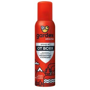 Аэрозоль от всех летающих кровососущих насекомых и клещей, 150 мл Gardex Extreme Защищает от всех летающих кровососущих насекомых (комаров, москитов, слепней, мокрецов, мошек, блох), а также от таежных и лесных клещей. Подходит для нанесения на открытые участки кожи или на одежду и снаряжение из натуральных тканей. Защита от комаров и других летающих насекомых при применении на кожу – более 4 часов, на одежду – до 30 суток. Защита от клещей обеспечивается ТОЛЬКО применением средства на одежду и действует до 5 суток. Инновационная формула UNIMAX с трехкомпонентным составом заявлена на получение патента.