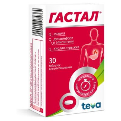 Показания Гастал® не оказывает системного действия у пациентов с нормальной функцией почек. После взаимодействия с соляной кислотой желудочного сока, алюминия гидроксид реагирует с фосфатами и карбонатами в щелочной среде кишечника и выделяется с калом в виде нерастворимых солей. Магния гидроксид реагирует с соляной кислотой в желудочном соке с образованием магния хлорида, обладающего осмотическими свойствами и мягким слабительным действием, которое нейтрализует закрепляющее действие алюминия гидроксида в тонком кишечнике. Магний выводится с калом в виде нерастворимого карбоната. Фармакологическое действие Комбинированное антацидное средство. Снижает повышенную кислотность желудочного сока и не оказывает стимулирующего влияния на секрецию желудочного сока. Алюминия гидроксида-магния карбоната гель и магния гидроксид обеспечивают немедленную (сразу же после приема) и продолжительную (около 2 ч) нейтрализацию соляной кислоты желудочного сока, с поддержанием кислотности в желудке на физиологическом уровне (pH 3-5). 1 таблетка препарата Гастал® нейтрализует около 21.5 ммоль соляной кислоты. Гастал® подавляет действие пепсина, лизолецитина и желчных кислот, устраняет диспептические явления. Усиливает защитные и регенеративные процессы в слизистой оболочке желудка. Ионы алюминия оказывают цитопротекторное действие за счет повышения секреции муцина и натрия гидрокарбоната, активации простагландина E2 и NO, накопления эпидермального фактора роста в месте повреждения слизистой оболочки, повышения концентрации фосфолипидов в стенке желудка. Лекарственное взаимодействие Гастал® при одновременном применении усиливает активность леводопы и налидиксовой кислоты, снижает и замедляет абсорбцию хинолонов, изониазида, напроксена, препаратов железа, индометацина, аминазина, бета-адреноблокаторов, дифлунизала, блокаторов гистаминовых Н2-рецепторов, жирорастворимых витаминов, непрямых антикоагулянтов, барбитуратов. При взаимодействии с ионами металлов, входящих в состав антацидов, тетрациклины образуют нерастворимые хелатные комплексы; в результате данного взаимодействия всасывание тетрациклинов уменьшается более чем на 90%. Одновременный прием этих препаратов невозможен. При необходимости сочетанного применения тетрациклин следует принимать не менее чем за 2 ч до приема антацида. В присутствии алюминия гидроксида и магния гидроксида, содержащихся в препарате Гастал®, всасывание ципрофлоксацина и офлоксацина уменьшается на 50-90%. В присутствии антацидов биодоступность каптоприла существенно снижается, а сочетанное применение антацидов и метопролола приводит к уменьшению концентрации метопролола в плазме крови. При одновременном применении антацидов в высоких дозах возможно снижение всасывания ранитидина на 10-33%. Применение антацидов не влияет на биодоступность амоксициллина, цефалексина и комбинации амоксициллина и клавулановой кислоты, однако может существенно снижать всасывание доксициклина из ЖКТ. Повышение pH мочи на фоне терапии антацидами может способствовать повышению канальцевой реабсорбции щелочных лекарственных средств и снижать реабсорбцию кислых соединений. Антациды могут снижать и замедлять абсорбцию салицилатов, в т.ч. ацетилсалициловой кислоты, а также, повышая pH мочи, способствоват
