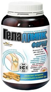 Геладринк Форте — Биологически активная добавка (БАД) к пище — является уникальным хондропротектором. В его состав входят три важнейших элемента для опрно-двигательной системы: коллаген, глюкозамин и хондроитин. Все они находятся в оптимально подобранном соотношении для достижения наилучшего терапевтического эффекта.Содержание в 12 капсулах (дневная норма):Хондропротекторы:Пептидный коллагеновый гидролизат «Gelita®» 300 мгГлюкозамин сульфат 500 мгХондроитин сульфат 800 мгМСМ натуральный 600 мгБосвеллия Серрата 100 мгАнтиоксиданты:Витамин С 100 мгВитамин Е 50 мгСелен 50 мкгМарганец 2 мгГеладринк Форте является комплексным хондропротектором, который выполняет функцию восстановления нормального метаболизма хрящевой ткани, стимулирует процесс синтеза естественного коллагена, повышает антиоксидантную защиту и обеспечивает суставы и позвоночник дополнительными питательными веществами.Хондропротекторы:Пептидный гидролизат коллагена «Gelita®» влияет на деятельность клеток хрящей и костей, ускоряя процессы заживления хрящевой ткани. Является источником жизненно важных аминокислот — глицина и пролина, гидроксипролина и гидроксилизина, необходимых для образования структуры коллагена. Повышает образование суставного коллагена на 100%. Коллаген — белок, отвечающий за прочность хрящей суставов, придаёт тканям суставов упругость, прочность и стойкость к нагрузкам. Коллагеновые пептиды «Gelita®» являются "интенсивным усиленным питанием" для суставов и позвоночника, стимулируют регенерацию всех тканей суставной системы — костей суставных головок, связок, синовиальных мембран; восстанавливают подвижность суставов и позвоночника. Другим компонентом коллагенового гидролизата «Gelita®» является биологически активный трипептид глицин-гистидин-лизин, который влияет на метаболизм хрящевых и костных клеток, способствует их размножению и образованию молодых клеток, которые регенерируют суставную ткань. Коллагеновые пептиды «Gelita®» являются веществом положительно и длительно влияющим на структуру и механическую устойчивость суставного хряща. Коллагеновый гидролизат «Gelita®» клинически апробирован на 2188 пациентах. Первый стойкий положительный эффект пациенты ощущают после 2-х недельного употребления. После 8-12 недель применения — происходит значительное улучшение подвижности суставов. Внешние признаки действия пептидов коллагена — улучшение подвижности опорно-двигательного аппарата, уменьшение болевых ощущений, улучшение состояния кожи, волос и ногтей, улучшается общее качество жизни.Глюкозамин сульфат способствует регенерации поврежденной хрящевой ткани. Участвует в формировании и улучшает трофику соединительной ткани суставных поверхностей, сухожилий, связок, синовиальной жидкости, кожи, костной ткани, ногтей, клапанов сердца, кровеносных сосудов и слизистой пищеварительных, дыхательных и мочевых трактов. Имеет благоприятное влияние на метаболизм хряща — усиление анаболических и ослабление катаболических процессов, т.к. оказывает стимулирующий эффект на хондроциты, что заставляет их стимулировать увеличенное производство нормального коллагена и протеогликанов. Ингибирует активность ферментов, разрушающих соединительную ткань, в т.ч. хрящ. Стимулирует синтез гиалуроновой кислоты, обеспечивающей смазку, необходи