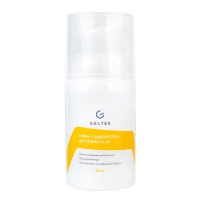 Крем-сыворотка Retiderm 0.25 – это лёгкая, кремообразная сыворотка, содержащая 0.25% активного ретинола двух видов: свободного и инкапсулированного в липосомах. Крем-сыворотка эффективно борется с морщинами и другими признаками фото- и хроностарения, пигментацией, воспалениями, потерей эластичности, расширенными порами, выравнивает рельеф кожи и значительно улучшает цвет лица. Выверенное сочетание ингредиентов с доказанной anti-age эффективностью, таких как ретинол и ниацинамид, и мощных антиоксидантов (витаминов С и Е), а также пребиотических, питательных и интенсивно увлажняющих компонентов, позволило создать средство, обладающее способностью заставить возрастную кожу функционировать, как в молодости. Крем-сыворотка Retiderm 0.25 значительно улучшает качество кожи, максимально восстанавливая её упругость, эластичность, способствуя появлению естественной гладкости и сияния. Кроме того, препарат балансирует выработку себума, уменьшает выраженность возрастного акне, стимулирует обновление эпидермиса, улучшает микроциркуляцию и делает тон кожи равномерным.