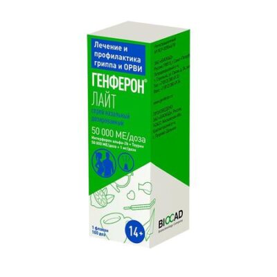 Показания При интраназальном применении за счет высокой концентрации в очаге инфекции достигается выраженный местный противовирусный и иммуностимулирующий эффект. Системное всасывание препарата незначительно — низкая биодоступность лекарственных средств при интраназальном введении связана с функционированием особого семейства белков из 25 протеинов, входящих в состав слизистой оболочки полости носа и контролирующих транспорт всех молекулярных и клеточных объектов, проникающих через слизистую. В то же время, некоторое количество препарата попадает в системный кровоток, за счет чего достигается системный иммуномодулирующий эффект. Фармакологическое действие В состав препарата Генферон® лайт входит рекомбинантный человеческий интерферон альфа-2b, вырабатываемый штаммом бактерии Escherichia coli, в которую методами генной инженерии введен ген интерферона альфа-2b человека. Интерферон альфа-2b оказывает противовирусное, иммуномодулирующее, антипролиферативное и антибактериальное действие. Противовирусный эффект опосредован активацией ряда внутриклеточных ферментов, ингибирующих репликацию вирусов. Иммуномодулирующее действие проявляется, в первую очередь, усилением клеточно-опосредованных реакций иммунной системы, что повышает эффективность иммунного ответа в отношении вирусов, внутриклеточных паразитов и клеток, претерпевших опухолевую трансформацию. Это достигается за счет активации CD8+ Т-киллеров, NK-клеток (естественных киллеров), усилении дифференцировки В-лимфоцитов и продукции ими антител, активации моноцитарно-макрофагальной системы и фагоцитоза, а также повышении экспрессии молекул главного комплекса гистосовместимости I типа, что повышает вероятность распознавания инфицированных клеток клетками иммунной системы. Активизация под воздействием интерферона лейкоцитов, содержащихся во всех слоях слизистой оболочки, обеспечивает их активное участие в ликвидации патологических очагов; кроме того, за счет влияния интерферона достигается восстановление продукции секреторного иммуноглобулина А. Антибактериальный эффект опосредован реакциями иммунной системы, усиливаемыми под влиянием интерферона. Таурин способствует нормализации метаболических процессов и регенерации тканей, обладает мембраностабилизирующим и иммуномодулирующим действием. Являясь сильным антиоксидантом, таурин непосредственно взаимодействует с активными формами кислорода, избыточное накопление которых способствует развитию патологических процессов. Таурин способствует сохранению биологической активности интерферона, усиливая терапевтический эффект применения препарата. Лекарственное взаимодействие Не рекомендуется одновременное применение интраназальных сосудосуживающих препаратов, т.к. это способствует дополнительному высушиванию слизистой оболочки носа.