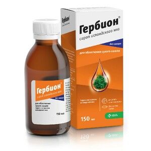 Внешний вид препарата Гербион, сироп исландского мха и содержимое упаковки:Жидкость от желтовато-коричневого до коричневого цвета, слегка опалесцирующая, со специфическим запахом и вкусом. Может наблюдаться незначительный осадок, характерный для природных субстанций.