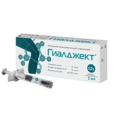 Имплантат ГИАЛДЖЕКТ® представляет собой стерильный бесцветный прозрачный однородный вязкий гель без механических примесей, полученный методом бактериальной ферментации. Имплантат ГИАЛДЖЕКТ® не содержит животных белков и не требует предварительного аллерготеста. Гиалуроновая кислота представляет собой природный гликозаминогликан межклеточного матрикса, обладающий наибольшей гигроскопичностью из всех известных естественных мукополисахаридов. Механизм действия. Гиалуроновая кислота — естественный полисахарид, принадлежащий к классу гликозаминогликанов, входящий в состав всех тканей организма и являющийся важнейшим структурным элементом синовиальной жидкости. Гиалуроновая кислота является немодифицированной. Имплантат ГИАЛДЖЕКТ® содержит в своем составе натриевую соль гиалуроновой кислоты и воду, моле- кулы которых образуют водородные связи благодаря наличию в структуре молекул гидроксильных групп (ОН-групп), а также наличию большого количества атомов кислорода и азота в молекуле гиалуроновой кислоты. Вследствие образования водородных связей с молекулами воды гиалуроновая кислота имеет высокую способность связывать и удерживать воду, приобретая желеобразную структуру. Макромолекулы гиалуроновой кислоты благодаря тем же механизмам образуют внутримолекулярные и межмолекулярные взаимодействия, давая при этом достаточно стабильную трехмерную структуру. Имплантат ГИАЛДЖЕКТ® имеет упорядоченную структуру геля, которая способна удерживать молекулы гиалуроновой кислоты и воды внутри синовиальной сумки, обеспечивая стабильность Имплантата ГИАЛДЖЕКТ®, что гарантирует пролонгированное действие изделия. Вязкоэластичные свойства гиалуроновой кислоты, входящей в состав синовиальной жидкости, обеспечивают смазывание и амортизацию суставных поверхностей. Синовиальная жидкость в суставах при дегенеративных заболеваниях (остеоартроз) или травматических измене- ниях суставов имеет более низкую вязкость и эластичность, чем в здоровых суставах. Гиалуроновая кислота, входящая в состав Имплантата ГИАЛДЖЕКТ®, имеет молекулярную массу 2,2 млн дальтон, близкую к естественной гиалуроновой кислоте человека, и оказывает положительный эффект после введения при диагнозе «остеоартроз» (остеоартрит). Внутрисуставное введение Имплантата ГИАЛДЖЕКТ® восстанавливает физиологические и реологические свойства синовиальной жидкости сустава, пораженного остеоартрозом. Вследствие этого уменьшается боль и дискомфорт, улучшается под вижность в суставе. Введение в проекцию зоны повреждения связочного аппарата, околосухожильное пространство (сухожильные каналы) Имплантата ГИАЛДЖЕКТ® приводит к уменьшению или полному купированию болевого синдрома. Рекомендуемый курс применения Для внутрисуставного введения Для постепенного заполнения синовиального пространства сустава Имплантат ГИАЛДЖЕКТ® вводится курсом от одной до пяти инъекций с недельным интервалом между каждой инъекцией. Количество инъекций и длительность курса введения определяются врачом, рекомендуемая максимальная длительность курса введения — не более шести недель. Перерыв между курсами введения Имплантата ГИАЛДЖЕКТ® определяется врачом, рекомендуе- мый перерыв — от 6 до 12 месяцев. Возможно одновременное применение Имплантата ГИАЛДЖЕКТ® дл