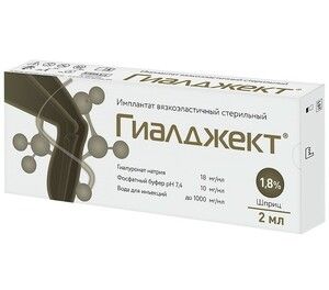Средство для внутрисуставного введения 1,8% по 2 мл в шприц — 1 преднаполненный шприц инъекционный однократного применения с инструкцией по применению в пачке из картона. Игла в комплект не входит.ГИАЛДЖЕКТ ИМПЛАНТАТ ВЯЗКОЭЛАСТИЧНЫЙ СТЕРИЛЬНЫЙ — предназначен для внутрисуставного введения и для околосухожильного введения: введение в проекцию зоны повреждения связочного аппарата, околосухожильное пространство (сухожильные каналы).Условия применения: Имплантат ГИАЛДЖЕКТ применяется в условиях специальных отделений лечебно-профилактических учреждений.Потенциальные потребители — специально обученный специалист (врач-травматолог, врач-ревматолог, врач-невролог или врач-хирург).Область применения — ортопедия, ревматология, травматология, неврология, спортивная медицина.Основные параметры и характеристики.Нормы соответствия Имплантата ГИАЛДЖЕКТ.1 Внешний вид Бесцветный прозрачный однородный вязкий гель без механических примесей2 Подлинность При смешивании 1-2 мл Имплантата с 50 мл. этилового спирта появляются белые волокна3 Динамическая вязкость, мПа·с Концентрация до 2% 5000 — 450004 Водородный показатель, pH 6,5 — 8,05 Осмолярность, мОсмоль/л 250 — 3506 Стерильность Должен быть стерилен7 Бактериальные эндотоксины, БЭ/мл: Не более 0,58 Извлекаемый объем Имплантата, млИмплантат вязкоэластичный стерильный ГИАЛДЖЕКТ по ТУ 32.50.22-003-18527908-2019 2 мл в шприце объемом 2,25 мл от 2,0 до 2,2 млФУНКЦИОНАЛЬНЫЕ ХАРАКТЕРИСТИКИ.Имплантат ГИАЛДЖЕКТ представляет собой стерильный бесцветный прозрачный однородный вязкий гель без механических примесей, полученный методом бактериальной ферментации.Имплантат ГИАЛДЖЕКТ не содержит животных белков и не требует предварительного аллерготеста. Гиалуроновая кислота представляет собой природный гликозаминогликан межклеточного матрикса, обладающий наибольшей гигроскопичностью из всех известных естественных мукополисахаридов.МЕХАНИЗМ ДЕЙСТВИЯ.Гиалуроновая кислота — естественный полисахарид, принадлежащий к классу гликозаминогликанов, входящий в состав всех тканей организма и являющийся важнейшим структурным элементом синовиальной жидкости. Гиалуроновая кислота является немодифицированной.Имплантат ГИАЛДЖЕКТ содержит в своем составе натриевую соль гиалуроновой кислоты и воду, молекулы которых образуют водородные связи благодаря наличию в структуре молекул гидроксильных групп (ОН-групп), а также наличию большого количества атомов кислорода и азота в молекуле гиалуроновой кислоты. Вследствие образования водородных связей с молекулами воды гиалуроновая кислота имеет высокую способность связывать и удерживать воду, приобретая желеобразную структуру.Макромолекулы гиалуроновой кислоты благодаря тем же механизмам образуют внутримолекулярные и межмолекулярные взаимодействия, давая при этом достаточно стабильную трехмерную структуру.Имплантат ГИАЛДЖЕКТ имеет упорядоченную структуру геля, которая способна удерживать молекулы гиалуроновой кислоты и воды внутри синовиальной сумки, обеспечивая стабильность Имплантата ГИАЛДЖЕКТ, что гарантирует пролонгированное действие изделия.Вязкоэластичные свойства гиалуроновой кислоты, входящей в состав синовиальной жидкости, обеспечивают смазывание и амортизацию суставных поверхностей. Синовиальная жидкость в суставах при дегенеративных забол
