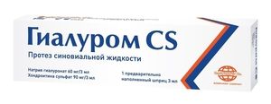 Показания к применению- для симптоматического лечения остеоартрита легкой, средней или тяжелой степени — при боли и ограничении подвижности, вызванных дегенеративно-дистрофическими или посттравматическими изменениями коленного, тазобедренного и других синовиальных суставов — для облегчения боли после проведения артроскопии (применение возможно не ранее, чем через 1 неделю после вмешательства).Противопоказания- установленная повышенная чувствительность к компонентам данного медицинского изделия — наличие активных воспалительных или инфекционных процессов в суставе — наличие признаков активного заболевания кожи или кожной инфекции в области предполагаемой инъекции — применение у пациентов с установленным диагнозом аутоиммунного заболевания или проходящих курс иммунотерапии — применение при беременности или в период лактации — возраст до 18 лет.Состав1 предварительно наполненный шприц Гиалуром CS. Гиалуронат натрия 60,00 мг. Хондроитин сульфат натрия 90,00 мг. Натрия хлорид 10,50 мг. Натрия дигидрофосфат моногидрат 1,35 мг.Динатрийфосфат додекагидрат 15,15 мг.Гидроксид натрия и/или хлористоводородная кислота (для корректировки рН). Вода для инъекций до 3,00 мл.Взаимодействие с другими препаратамиМеры предосторожности