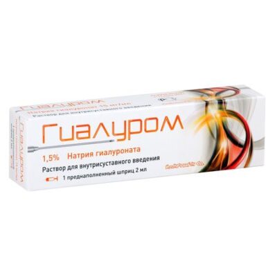 Раствор для внутрисуставного введения ГИАЛУРОМ — 1,5 % раствор натрия гиалуроната в одноразовых шприцах по 2 мл представляет собой стерильный, вязкоэластичный раствор гиалуроната натрия. Гиалуронат натрия получен в результате брожения.Гиалуронат натрия ГИАЛУРОМ представляет собой полисахарид идентичный человеческому, состоит из повторяющихся дисахаридных звеньев N-ацетилгликозамина и глюкуроната натрия, с молекулярной массой, превышающей 2 400 000 Да.Гиалуронат натрия производится в организме человека и является главным компонентом внутрисуставной жидкости. Он переносит питательные вещества выступает как смазка, снижая трение между суставными элементами и обеспечивая плавное движение.При артрозе и травмах сустава качество внутрисуставной жидкости снижается, производство гиалуроната натрия нарушается, сустав испытывает перегрузку, хрящи разрушаются.Гиалуром при внедрении в сустав улучшает качество синовиальной жидкости, устраняет боль и возвращает подвижность.Смазывающее и амортизирующее действие этого препарата смягчают боли и улучшают подвижность сустава при внутрисуставном применении.Данные эффекты продолжаются более 6 месяцев после одного курса лечения.Раствор ГИАЛУРОМ применяется как вязкоэластичная добавка для замещения синовиальной жидкости при болях, вызванных дегенеративными заболеваниями синовиальных суставов, такие как остеоартрит или остеоартроз.По своему действию препарат ГИАЛУРОМ служит смазкой и механической поддержкой для больного сустава.Раствор ГИАЛУРОМ вводится в суставы человека:-при болях и ограниченной подвижности, вызванных дегенеративно-дистрофическими и травматическими изменениями коленного, тазобедренного и других синовиальных суставов;-для временного замещения и восполнения синовиальной жидкости;-при лечении пациентов, ведущих активный образ жизни и регулярно нагружающих пораженный сустав.