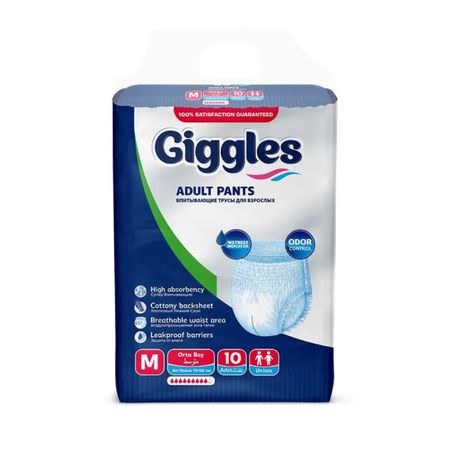 Трусы-подгузники GIGGLES (Гигглс) для взрослых высокой степени впитываемости помогают при возрастных проблемах, травмах, в послеродовой период. Нетканый материал позволяет жидкости быстро проходить внутрь, а не пропускающие жидкость барьеры защищают от протекания. Антибактериальный абсорбент Gel Core сразу превращает её в гель. Подгузники трусы гипоаллергенны — подходят для чувствительной кожи. Универсальны — для мужчин и женщин благодаря эластичным материалам, без добавления латекса. Трусы подгузники для взрослых — прекрасное решение для использования при средней и тяжелой степени недержания для людей, ведущих активный образ жизни. Мужские и женские подгузники-трусы премиум качества подходят для носки на каждый день и ночь, соответствуют стандартам качества медицинских изделий и протестированы дерматологами, дарят комфорт, обеспечивают гигиену и Ваше здоровье. Подгузники трусики отлично подойдут для гигиены до и после родов, а также в качестве менструальных трусов для женщин с обильными выделениями во время менструации. Хорошо впитывающие урологические трусы выглядят как мягкое нижнее белье из дышащего материала. Изделие адаптируется под фигуру и остается незаметным под одеждой. Размер M. Обхват талия/бедра 70-120 см. 10 штук в упаковке.