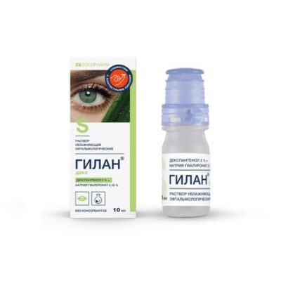 Медицинское изделие раствор увлажняющий офтальмологический Гилан® Декс (далее — раствор, изделие) представляет собой бесцветный слегка вязкий раствор. Область применения — офтальмология. Раствор предназначен для ухода за глазами путем закапывания в конъюнктивальный мешок. Раствор увлажняющий офтальмологический Гилан® Декс воспроизводит действие естественной слезы, защищает и увлажняет поверхность глаза и смазывает ее. Это средство оказывает долговременное облегчающее действие при сухости глаз, обусловленной различными факторами: • нарушения слезной пленки, что приводит к понижению секреции слезы и вызывает симптомы дискомфорта; • воздействие внешней среды (центральное отопление, климатические установки, флуоресцентные лампы, хлорированная вода, кондиционированный воздух, различные природные явления — ветер, холод, пыль, дым, смог); • частая продолжительная работа за монитором компьютера; • зрительное утомление (например, работа с микроскопом, а также при длительном вождении автомобиля); • использование сосудосуживающих или противовоспалительных офтальмологических препаратов; • повреждения и травмы роговицы; • изменения гормонального фона (менопауза); • пожилой возраст (75 % населения старше 65 лет страдает синдромом «сухого» глаза). Свойства и эффективность Медицинское изделие Гилан® Декс представляет собой стерильный 0,18 % водный раствор натрия гиалуроната с декспантенолом (2 %), не содержащий консервантов. Действующее вещество — высокоочищенный натрия гиалуронат, произведенный методом бактериальной ферментации. Натрия гиалуронат является физиологическим полисахаридным соединением, содержащимся как в тканях глаза, так и других тканях и жидкостях организма человека. Особым физико-химическим свойством молекул натрия гиалуроната является их выраженная способность связывать молекулы воды. Водный раствор натрия гиалуроната (ГИЛАН) обладает необходимой вязкостью и высокими адгезивными свойствами, эффективно увлажняет поверхность глаза. Раствор содержит провитамин B5 (декспантенол), который благодаря высокой способности связывать воду, увлажняет глаза и обеспечивает дополнительный уход. Таким образом, влагоудерживающие свойства натрия гиалуроната усиливаются. Также декспантенол по своим функциональным свойствам как противовоспалительное и ранозаживляющее средство, способствует более быстрому заживлению и восстановлению глаз после травм и операций. При применении офтальмологического раствора Гилан® Декс на эпителии роговой оболочки глаза образуется тонкая равномерная пленка, предохраняющая глаза от пересыхания, раздражения и развития воспаления передней поверхности глазного яблока. Действие защитной пленки начинается мгновенно, тем самым глаза надолго защищены от ощущения сухости, рези, чувства инородного тела, раздражения, которые часто возникают при работе за компьютером, при длительном использовании кондиционеров или другого офисного оборудования, в случаях ухудшения экологической обстановки. Образующаяся после закапывания прероговичная слезная пленка сохраняется в течение длительного периода времени, не смывается при моргании и не вызывает снижение остроты зрения. Достаточное увлажнение поверхности глаза раствором Гилан® Декс способствует нормализации физиологических 