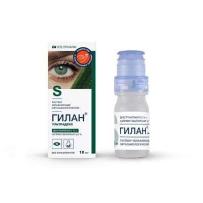 Раствор увлажняющий офтальмологический Гилан® Ультрадекс (далее — раствор, медицинское изделие) представляет собой бесцветный слегка вязкий раствор. Область применения — офтальмология. Раствор предназначен для ухода за глазами путем закапывания в конъюнктивальный мешок. Раствор увлажняющий офтальмологический Гилан® Ультрадекс воспроизводит действие естественной слезы, защищает и увлажняет поверхность глаза и смазывает ее. Это средство оказывает долговременное облегчающее действие при сухости глаз, обусловленной различными факторами: • нарушения слезной пленки, что приводит к понижению секреции слезы и вызывает симптомы дискомфорта; • воздействие внешней среды (центральное отопление, климатические установки, флуоресцентные лампы, хлорированная вода, кондиционированный воздух, различные природные явления — ветер, холод, пыль, дым, смог); • частая продолжительная работа за монитором компьютера; • зрительное утомление (например, работа с микроскопом, а также при длительном вождении автомобиля); • использование сосудосуживающих или противовоспалительных офтальмологических препаратов; • повреждения и травмы роговицы; • изменения гормонального фона (менопауза); • пожилой возраст (75 % населения старше 65 лет страдает синдромом «сухого» глаза). Свойства и эффективность Медицинское изделие Гилан® Ультрадекс представляет собой стерильный 0,3 % водный раствор натрия гиалуроната с декспантенолом (2 %), не содержащий консервантов. Действующее вещество — высокоочищенный натрия гиалуронат, произведенный методом бактериальной ферментации. Натрия гиалуронат является физиологическим полисахаридным соединением, содержащимся как в тканях глаза, так и других тканях и жидкостях организма человека. Особым физико-химическим свойством молекул натрия гиалуроната является их выраженная способность связывать молекулы воды. Водный раствор натрия гиалуроната (ГИЛАН) обладает необходимой вязкостью и высокими адгезивными свойствами, эффективно увлажняет поверхность глаза. Раствор содержит провитамин B5 (декспантенол), который благодаря высокой способности связывать воду, увлажняет глаза и обеспечивает дополнительный уход. Таким образом, влагоудерживающие свойства натрия гиалуроната усиливаются. Также декспантенол по своим функциональным свойствам как противовоспалительное и ранозаживляющее средство, способствует более быстрому заживлению и восстановлению глаз после травм и операций. При применении офтальмологического раствора Гилан® Ультрадекс на эпителии роговой оболочки глаза образуется тонкая равномерная пленка, предохраняющая глаза от пересыхания, раздражения и развития воспаления передней поверхности глазного яблока. Действие защитной пленки начинается мгновенно, тем самым глаза надолго защищены от ощущения сухости, рези, чувства инородного тела, раздражения, которые часто возникают при работе за компьютером, при длительном использовании кондиционеров или другого офисного оборудования, в случаях ухудшения экологической обстановки. Образующаяся после закапывания прероговичная слезная пленка сохраняется в течение длительного периода времени, не смывается при моргании и не вызывает снижение остроты зрения. Достаточное увлажнение поверхности глаза раствором Гилан® Ультрадекс способствует нормал