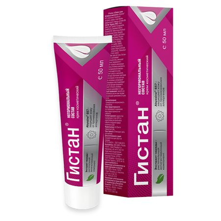 Крем для тела «Гистан» защищает и успокаивает чувствительную кожу, уменьшает покраснения, раздражения и усиливает процессы регенерации эпидермиса. Активные компоненты крема негормональной природы быстро впитываются в кожу, устраняют сухость и шелушение, способствуют облегчению симптомов кожной аллергии, при укусах насекомых, активизируют бактерицидные и восстанавливают защитные функции эпидермиса, облегчают дискомфорт от зуда, снижают отечность и болевые ощущения. Abyssine® 657 экзополисахарид, синтезируемый бактериями Alteromonas maceodii – уникальными микроорганизмами, живущими в гидротермальных расщелинах с невероятными условиями. Установлено, что эта молекула оказывает удивительные противовоспалительное и успокаивающее действия, защищая чувствительную кожу, реагирующую на аллергены. Abyssine® 657 препятствует проникновению аллергенов в более глубокие слои кожи, чем помогает предотвратить возникновение кожной аллергии. Экстракт почек березы – обладает антисептическим и противозудным действиями, уменьшает раздражение и покраснение кожи, оказывает противовоспалительное и противогрибковое действия. Экстракт череды – имеет ярко выраженные бактерицидные свойства. Широко используется при диатезе. Д-пантенол – снимает раздражение, обладает заживляющим, успокаивающим кожный зуд, увлажняющим и смягчающим действиями, помогает при шелушении. Делает кожу более эластичной. Эфирное масло лаванды – обладает бактерицидными, дезинфицирующими, антисептическими и противовоспалительными свойствами, оно хорошо справляется с различными раздражительными и воспалительными процессами на коже, устраняет покраснения, шелушение и зуд. Также эфирное масло лаванды славится своими ранозаживляющими и регенерирующими свойствами. Бисаболол – обладает противовоспалительным действием, успокаивает кожу, снимает раздражение. Витамин В6 — известный также как пиридоксин, способствует восстановлению кожи и улучшению её состояния