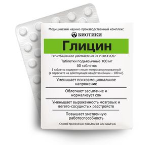 Показания к применению сниженная умственная работоспособность; стрессовые ситуации – психоэмоциональное напряжение (в период экзаменов, при конфликтных и т.п. ситуациях); девиантные (отклоняющиеся от нормы) формы поведения детей и подростков; различные функциональные и органические заболевания нервной системы, сопровождаю- щиеся повышенной возбудимостью, эмоциональной нестабильностью, снижением умственной работоспособности, памяти и нарушением сна: неврозы, неврозоподобные состояния и вегето-сосудистая дистония, стрессовые нервные расстройства, последствия нейроинфекций и черепно-мозговой травмы, перинатальные и другие формы энцефалопа- тий (в т.ч. алкогольного генеза); ишемический инсульт.Применение при беременности и кормлении грудьюГлицин не рекомендуеться назначать в период беременности и грудного вскармливания в связи с отсутствием достаточ- ного количества данных.ПротивопоказанияГиперчувствительность к глицину или к другим компонентам препарата.Побочное действиеАллергические реакции (очень редкие).Состав1 таблетка содержит:Активное вещество: глицин микрокапсулированный 100 мг.Вспомогательные вещества: магния стеарат 1 мг, метилцеллюлоза водорастворимая 1 мг.Взаимодействие с другими препаратамиОслабляет выраженность побочных эффектов антипсихотических средств (нейролептиков), анксиолитиков, антидепрес- сантов, снотворных и противосудорожных средств.