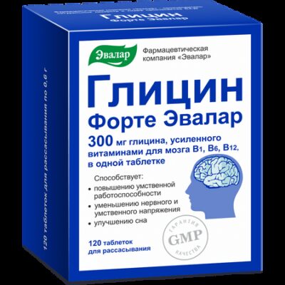 Компания «Эвалар» производит Глицин форте Эвалар, аналогичный зарубежным – с повышенным содержанием глицина, что положительно влияет на деятельность нервной системы: способствует повышению умственной работоспособности, снижению повышенной раздражительности, нормализации сна. Впервые действие глицина усилено максимальной дозировкой витаминов B1, B6, B12 в таком соотношении, как они существуют в природе. Витамины группы В благотворно влияют на нервную систему, помогают противодействовать стрессу. Сочетание в одной таблетке глицина и витаминов группы В необходимо нашему мозгу при повышенных умственных и психоэмоциональных нагрузках. Всего 2 таблетки Глицин форте Эвалар в день способствуют: повышению умственной работоспособности; уменьшению нервного и умственного напряжения; улучшению сна. Таблетки Глицин форте Эвалар удобны в применении, легко рассасываются, что способствует более быстрому достижению эффекта – уменьшению нервного напряжения и повышению умственной работоспособности.