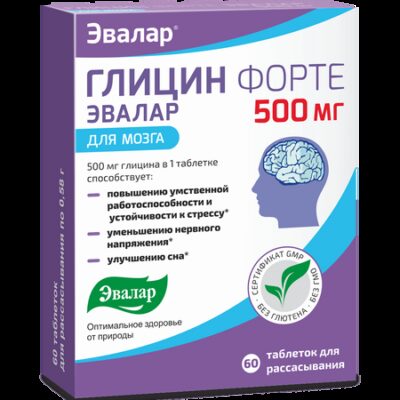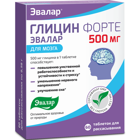 Глицин Форте 500мг В каждой таблетке повышенное содержание1 глицина (500 мг), усиленного витаминами для мозга В1, В6, В12. Активное вещество: глицин, цианокобаламин (витамин В12), пиридоксина гидрохлорид (витамин В6), тиамина гидрохлорид (витамин В1). Действие: для уменьшения нервного и умственного напряжения, повышения устойчивости к стрессу, улучшения настроения и сна, повышения умственной работоспособности, памяти и внимания. Глицин Форте Эвалар 500 мг отличается: 1. Повышенным1 содержанием глицина (500 мг). 2. Действие глицина усилено витаминами B1, B6, B12 в таком соотношении, как они существуют в природе. Витамины группы В благотворно влияют на центральную и периферическую нервную систему, способствуют восстановлению поврежденных нервных волокон, помогают противодействовать стрессу. 3. Таблетки легко рассасываются, что способствует быстрому достижению эффекта: