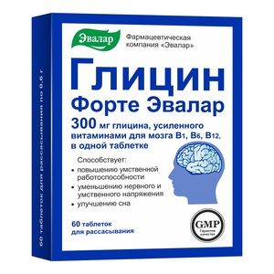 Биологически активная добавка (БАД) к пище для повышения умственной работоспособности, уменьшения нервного и умственного напряжения, улучшения сна.В каждой таблетке высокое содержание глицина (300 мг), усиленного витаминами для мозга В1, В6, В12.Активные вещества: глицин, цианокобаламин (витамин В12), пиридоксина гидрохлорид (витамин В6), тиамина гидрохлорид (витамин В1).Содержание в 2 таблетках (суточном приеме):Глицин, не менее 600 мг, что составляет 17% от адекватного уровня суточного потребленияПиридоксин (витамин B6), не более 6 мг, что составляет 300%* от адекватного уровня суточного потребленияТиамин (витамин B1), не более 5 мг, что составляет 357%* от адекватного уровня суточного потребленияВитамин B12, не более 9 мкг, что составляет 900%* от адекватного уровня суточного потребления*Не превышает верхний допустимый уровень суточного потребления.Глицин Форте Эвалар отличается:1. Высоким содержанием глицина (300 мг).В норме у человека преобладает влияние парасимпатической нервной системы (спокойствие), а при длительной нервной нагрузке баланс нарушается, и более активной становится симпатическая нервная система (активность). В результате повышенная активность, которая необходима человеку для решения конкретных задач, становится преобладающим состоянием перевозбуждения, которым сложно управлять. При этом снижается концентрация внимания, появляется чувство беспокойства, все труднее найти выход из сложной ситуации. Умственное напряжение, невозможность уснуть, расслабиться приводят к истощению нервной системы. С проблемой такого уровня сложно справиться самому. Во всем мире для решения этих проблем широко используется глицин — как нелекарственное средство, способствующее уменьшению стресса и умственного перенапряжения, причем в значительных количествах.2. Действие глицина усилено витаминами B1, B6, B12 в таком соотношении, как они существуют в природе.Витамины группы В благотворно влияют на центральную и периферическую нервную систему, способствуют восстановлению поврежденных нервных волокон, помогают противодействовать стрессу.3. Таблетки легко рассасываются, что способствует быстрому достижению эффекта: повышению умственной работоспособности; уменьшению нервного и умственного напряжения; улучшению сна.Глицин Форте Эвалар не формирует зависимости при длительном приеме, поскольку содержит естественные для организма действующие компоненты.Специальные особенности: без сахара, без глютена, без ГМО. Подходит веганам.Гарантия качества: произведено по международным стандартам GMP.**Сертификат GMP № С0170889-DS-2, NSF International (США).