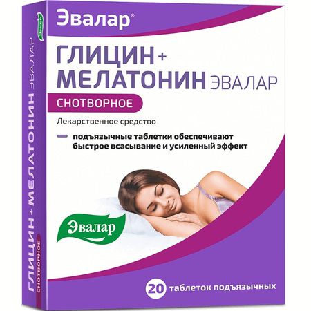 Показания Глицин легко проникает в большинство биологических жидкостей и тканей организма, в т.ч. в головной мозг, не кумулирует. Быстро разрушается в печени глициноксидазой до воды и углекислого газа. После сублингвального применения мелатонин быстро и полностью абсорбируется, минуя эффект «первого прохождения» через печень, в которой до 85% мелатонина превращается в неактивный метаболит, тем самым достигается высокий уровень биодоступности препарата. Средняя Cmax мелатонина в плазме крови достигается в течение 0.57 ч после сублингвального применения данной комбинации в дозе 3 мг и составляет 6.2 нг/мл. AUC 9.2 нг×ч/мл. Связывание мелатонина с белками плазмы составляет 60%. В основном мелатонин связывается с альбумином, α1 — кислым гликопротеином и ЛПВП. Vd около 35 л. Быстро распределяется в слюну и проходит через ГЭБ, определяется в плаценте. Концентрация в спинномозговой жидкости в 2.5 раза ниже, чем в плазме. Подвергается метаболизму преимущественно в печени, где происходит его гидроксилирование и конъюгация с сульфатом и глюкуронидом с образованием 6-сульфатоксимелатонина; уровень пресистемного метаболизма может достигать 85%. Экспериментальные исследования позволяют предположить, что в процессе метаболизма мелатонина принимают участие изоферменты CYP1A1, CYP1A2 и, возможно, CYP2C19. Основной метаболит мелатонина — 6-сульфатоксимелатонин, неактивен. Мелатонин выделяется из организма почками. Выведение осуществляется с мочой, около 90% в виде сульфатного и глюкуронового конъюгатов 6-гидроксимелатонина, а около 2-10% выводится в неизмененном виде. T1/2 составляет 0.7 ч. Фармакологическое действие Комбинированный лекарственный препарат. Глицин — заменимая аминокислота, центральный нейромедиатор тормозного типа действия. Улучшает метаболические процессы в тканях мозга, оказывает антидепрессивное и седативное действие. Обладает глицинергическим и ГАМК-ергическим, альфа- адреноблокирующим, антиоксидантным и антитоксическим действием; регулирует деятельность глутаматных (NMDA) рецепторов, за счет чего облегчает засыпание и нормализует сон, уменьшает психоэмоциональное напряжение, агрессивность и конфликтность; улучшает социальную адаптацию и настроение; повышает умственную работоспособность; уменьшает выраженность вегетативно-сосудистых нарушений (в т.ч. и в климактерическом периоде) и общемозговых расстройств при ишемическом инсульте и черепно-мозговой травме, снижает токсическое действие этанола на ЦНС. Мелатонин — синтетический аналог гормона шишковидного тела (эпифиза) мелатонина; оказывает адаптогенное, седативное, снотворное действие. Нормализует циркадные ритмы. Увеличивает концентрацию ГАМК и серотонина в среднем мозге и гипоталамусе, изменяет активность пиридоксалькиназы, участвующей в синтезе ГАМК, допамина и серотонина. Регулирует цикл сон-бодрствование, суточные изменения локомоторной активности и температуры тела, положительно влияет на интеллектуально-мнестические функции мозга, на эмоционально-личностную сферу. Способствует организации биологического ритма и нормализации ночного сна. Улучшает качество сна, ускоряет засыпание, снижает число ночных пробуждений, улучшает самочувствие после утреннего пробуждения, не вызывает ощущения вялости, разбитости и усталости при пробуждении. Делает сновидения бол