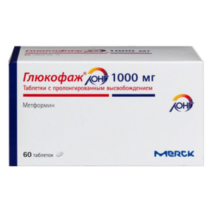 Показания к применению Сахарный диабет 2 типа у взрослых, особенно у пациентов с ожирением, при неэффективности диетотерапии и физических нагрузок: в качестве монотерапии в сочетании с другими пероральными гипогликемическими средствами или с инсулином. Монотерапия предиабета в случае, если изменение образа жизни не позволило достичь адекватного гликемического контроля.Применение при беременности и кормлении грудьюБеременность Неконтролируемая гипергликемия в периконцепционный период и во время беременности связана с повышенным риском врожденных пороков, выкидышей, артериальной гипертензией, вызванной беременностью, преэклампсией и перинатальной смертностью.Необходимо поддерживать концентрацию глюкозы в плазме крови, как можно ближе к норме, для снижения риска возникновения неблагоприятных исходов, ассоциированных с гипергликемией, для матери и плода. Метформин проникает через плаценту в концентрациях, которые могут быть такими же высокими, как и у матери. Большое количество данных о беременных женщинах (>1000 случаев), полученных в рамках когортного исследования на основе регистров, опубликованных в реестре (мета-анализы, клинические исследования и реестры), указывают на отсутствие повышенного риска врожденных аномалий или фето-/неонатальной токсичности после воздействия метформина в периконцепционныйпериод и/или во время беременности. Имеются ограниченные и неубедительные данные о влиянии метформина на долгосрочные результаты массы тела детей, подвергавшихся воздействию метформина внутриутробно. Метформин не влияет на двигательное и социальное развитие у детей в возрасте до 4 лет, подвергшихся воздействию препарата во время беременности, хотя данные о долгосрочных результатах ограничены. В случае клинической необходимости, применение метформина может быть рассмотрено во время беременности и в периконцепционный период в качестве дополнения или альтернативы инсулину. Грудное вскармливаниеМетформин проникает в грудное молоко.Нежелательные реакции у новорожденных при грудном вскармливании на фоне приема метформина не наблюдались.Однако в связи с ограниченным количеством данных, применение препарата в период грудного вскармливания не рекомендовано.Решение о прекращении грудного вскармливания должно быть принято с учетом пользы от грудного вскармливания и потенциального риска возникновения нежелательных реакций у ребенка. ФертильностьМетформин не влиял на фертильность самцов и самок крыс при введении в дозах до 600 мг/кг/день, что примерно в три раза превышает максимальную рекомендуемую суточную дозу.Состав 1 таблетка содержит Действующее вещество: метформина гидрохлорид — 1000,0 мг, Вспомогательные вещества: кармеллоза натрия — 50,0 мг, гипромеллоза 2208 — 392,3 мг, магния стеарат — 7,0 мг.