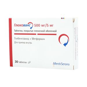 Показания к применениюСахарный диабет 2 типа у взрослых:- при неэффективности диетотерапии, физических упражнений и предшествующей монотерапии метформином или производным сульфонилмочевины;- для замещения предшествующей терапии двумя препаратами (метформином и производным сульфонилмочевины) у больных со стабильным и хорошо контролируемым уровнем гликемии.Применение при беременности и кормлении грудьюПрименение препарата противопоказано при беременности. Пациентку следует предупредить о том, что в период лечения препаратом Глюкованс необходимо информировать врача о планируемой беременности и о наступлении беременности. При планировании беременности, а также в случае наступления беременности в период применения препарата Глюкованс, препарат следует отменить и назначить лечение инсулином.Глюкованс противопоказан в период грудного вскармливания, поскольку отсутствуют данные о способности активных веществ препарата проникать в грудное молоко.Противопоказания- сахарный диабет 1 типа;- диабетический кетоацидоз;- диабетическая прекома, диабетическая кома;- почечная недостаточность или нарушение функции почек (КК <60 мл/мин);- острые состояния, которые могут приводить к изменению функции почек: дегидратация, тяжелая инфекция, шок, внутрисосудистое введение йодсодержащих контрастных средств;- острые или хронические заболевания, которые сопровождаются гипоксией тканей: сердечная или дыхательная недостаточность, недавно перенесенный инфаркт миокарда, шок;- печеночная недостаточность;- порфирия;- беременность;- период лактации (грудного вскармливания);- одновременный прием миконазола;- обширные хирургические операции;- хронический алкоголизм, острая алкогольная интоксикация;- лактацидоз (в т.ч. в анамнезе);- соблюдение гипокалорийной диеты (менее 1000 кал/сут);- повышенная чувствительность к компонентам препарата;- повышенная чувствительность к другим производным сульфонилмочевины.Не рекомендуется применять препарат у пациентов в возрасте старше 60 лет, выполняющих тяжелую физическую работу, что связано с повышенным риском развития у них лактацидоза.Глюкованс содержит лактозу, поэтому его применение не рекомендовано пациентам с редкими наследственными заболеваниями, связанными с непереносимостью галактозы, дефицитом лактазы или синдромом глюкозо-галактозной мальабсорбции.СоставВ 1 таблетке содержится: Глибенкламид 5 мгМетформина гидрохлорид 500 мгВспомогательные вещества: кроскармеллоза натрия — 14 мг, повидон К30 — 20 мг, целлюлоза микрокристаллическая — 54 мг, магния стеарат — 7 мг.Состав оболочки: опадрай 31-F-22700 желтый — 12 мг (лактозы моногидрат — 36%, гипромеллоза 15cP — 28%, титана диоксид — 20.42%, макрогол — 10%, краситель хинолин желтый — 3%, железа оксид желтый — 2.5%, железа оксид красный — 0.08%), вода очищенная — q.s.