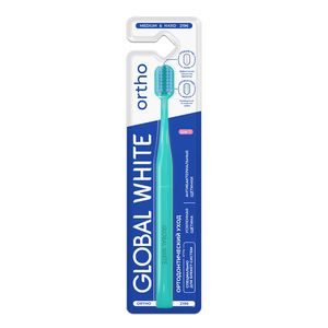 Ортодонтическая зубная щетка для вставных конструкций Global White обеспечивает эффективное очищение благодаря 2-х рядной технологии. Данная технология представляет из себя использование щетинок разной длины и жесткости. которые комфортно очищают эмаль. а также способствуют качественному удалению налета с конструкции. благодаря углублению в среднем ряду. Щетинки изготовлены из высококачественного антибактериального полиамида с алмазной полировкой. что обеспечивает эффективное и нетравматичое очищение. Сочетание жесткости щетин Medium (боковые ряды) и Hard (средний ряд) делает ортощетку незаменимым инструментом в гигиене во время ношения вставных конструкций. таких как брекет-системы. коронки и мосты. ухаживая и сохраняя их. На рукоятке щетки есть углубление-подсказка. для правильного и удобного положения руки при чистке.
