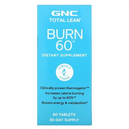 (Vitis vinifera)125 мг *Экстракт укропа (Anethum graveolens)5 мг ** Суточная норма не определена. Пищевая добавкаИзучен в клинических условияхКлинически подтвержденная эффективность.Найдите вдохновение, чтобы достичь желанного снижения веса.Вы едите более здоровую пищу и занимаетесь спортом, но нуждаетесь в дополнительном стимуле для достижения желанного снижения веса. Burn 60™ обеспечивает клинически подтвержденные результаты, которым вы можете доверять:Увеличивает сжигание калорий до 60%^Поддерживает энергетический обменСпособствует улучшению концентрации вниманияИспользуйте все возможности Burn 60™!GNC Total Lean® — это простой план для снижения веса:Заменители пищи и план питания и упражненийПоддержка метаболизма и уровня энергииОчищение и выведение токсиновСнек с витаминами, который можно взять с собой^ Клинически доказано, что продукт увеличивает сжигание калорий на 60% в течение одного часа после тренировки. В этом двойном слепом плацебо-контролируемом перекрестном исследовании приняли участие 22 здоровых человека (мужчины и женщины). Участники дважды тренировались на беговой дорожке. В одном случае они принимали Burn 60™ перед тренировкой, а во втором — вещество плацебо. Было измерено количество сожженных калорий в течение первого часа после тренировки. Во время приема Burn 60™ было сожжено на 60% больше калорий по сравнению с количеством сожженных калорий во время приема плацебо.
