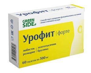БАД «Урофит форте»: способствует улучшению функционального состояния почек и мочевого пузыря оказывает мочегонное, спазмолитическое и антисептическое действиеСодержание биологически активных веществ в 4 таблетках (суточный прием): арбутин — 13,16 мг (164,5% от норм потребления) флавоноиды (17,33% от норм потребления) полифенолы (69,6% от норм потребления)Корень любистка лекарственный обладают антибактериальной активностью. Используется при инфекции мочевыводящих путей — содержащиеся в растении терпеновые производные вызывают усиленный диурез без потери электролитов. Также корни любистока используют для профилактики мочекаменной болезни, для лечения цистита, для уменьшения отеков, как естественное мочегонное и тонизирующее средство.Трава золототысячника способствует выведению излишков жидкости из организма без нарушения ионного баланса (калийсберегающий эффект).Уникальная противовоспалительная активность травы розмарина обыкновенного, в частности — розмариновой кислоты, используется и при лечении воспалительных заболеваний мочевыводящей системы: пиелонефрита, гломерулонефрита, цистита.Листья брусники обыкновенной активно применяются как диуретик и природное средство против цистита и уретрита. Брусника оказывает одновременно и антибактериальное, и противовоспалительное, и мочегонное действия, работая сразу по всем основным направлениям.