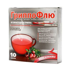 Показания к применениюИнфекционно-воспалительные заболевания (ОРВИ, грипп), сопровождающиеся высокой температурой, ознобом и лихорадкой, головной болью, насморком, заложенностью носа, чиханием и болями в мышцах.Применение при беременности и кормлении грудьюПротивопоказан во время беременности и в период лактации.ПротивопоказанияАртериальная гипертония; сахарный диабет; закрытоугольная глаукома; тяжелые заболевания печени, почек, сердца, щитовидной железы, легких (в том числе и бронхиальная астма), мочевого пузыря; язвенная болезнь желудка и двенадцатиперстной кишки; заболевания поджелудочной железы; затруднения мочеиспускания при аденоме предстательной железы; заболевания системы крови; дефицит фермента глюкозо-6-фосфатдегидрогеназы; беременность и период лактации; детям в возрасте до 12 лет; повышенная чувствительность к отдельным компонентам препарата.Побочное действиеАллергические реакции (кожная сыпь, зуд, крапивница, ангионевротический отек), тошнота, боли в эпигастрии, анемия, тромбоцитопения, агранулоцитоз.Повышенная возбудимость, головокружение, повышение артериального давления, сердцебиение, нарушение засыпания.Повышение внутриглазного давления, сухость во рту, задержка мочи.При длительном применении в больших дозах возможно гепатотоксическое и нефротоксическое действие (почечная колика, глюкозурия, инстерстициальный нефрит, папиллярный некроз), гемолитическая анемия, апластическая анемия, метгемоглобинемия, панцитопения.СоставВ 1 пакете содержится: Парацетамол 325 мг; фенилэфрина гидрохлорид 10 мг; фенирамина малеат 20 мг; аскорбиновая кислота 50 мгВзаимодействие с другими препаратамиУсиливает эффекты ингибиторов моноаминооксидазы, седативных лекарственных средств, этанола. Этанол усиливает седативное действие антигистаминных лекарственных средств.Антидепрессанты, противопаркинсонические и антипсихотические лекарственные средства, фенотиазиновые производные повышают риск развития задержки мочи сухости во рту, запоров.Глюкокортикостероиды увеличивают риск развития повышения внутриглазного давления.Парацетамол снижает эффективность урикозурических лекарственных средств и повышает эффективность непрямых антикоагулянтов.Трициклические антидепрессанты усиливают симпатомиметическое действие, одновременное назначение галотана повышает риск развития желудочковой аритмии.Снижает гипотензивное действие гуанетидина, который, в свою очередь, усиливает альфа-адреностимулирующую активность фенилэфрина.