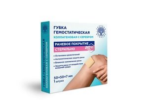 Губка представляет собой материал губчатой структуры от темно-жёлтого до коричневого цвета, в форме пластин со слабым специфическим запахом уксусной кислоты.Губка гемостатическая коллагеновая с серебром (в дальнейшем – Губка), предназначена для применения в качестве местного гемостатического средства и раневого покрытия с антисептическими свойствами для остановки кровотечений, закрытия ран от воздействия внешней среды и обеспечения влажного заживления ран.