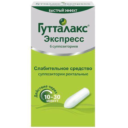 Показания Всасывание Абсорбция незначительная. Время развития слабительного эффекта препарата составляет 20 мин (от 10 мин до 30 мин, в некоторых случаях – 45 мин). Cmax активного метаболита в плазме после введения суппозитория достигается через 0.5-3 ч. Взаимосвязь между слабительным эффектом бисакодила и концентрацией активного метаболита в плазме отсутствует. Метаболизм Препарат практически полностью метаболизируется в стенке кишечника и печени до неактивного глюкуронида. Метаболизм бисакодила с образованием активного метаболита, бис-(п-гидроксифенил)-пиридил-2-метана, происходит под действием ферментов (эстераз) слизистой оболочки толстого кишечника. Выведение Т1/2 составляет около 16.5 ч. Выведение активного метаболита происходит в основном через кишечник (до 90% от общей экскреции), почками выводится до 3.1%. Небольшое количество неизмененного препарата выводится через кишечник. Фармакологическое действие Бисакодил — местное слабительное из группы производных дифенилметана с незначительным антирезорбтивным эффектом. После гидролиза в просвете толстого кишечника бисакодил стимулирует его перистальтику и способствует накоплению воды и электролитов в толстом кишечнике. Это приводит к стимуляции дефекации, уменьшению времени эвакуации и размягчению стула. Действие обусловлено прямой стимуляцией нервных окончаний в слизистой оболочке толстого кишечника. Бисакодил, являясь слабительным средством, действующим на уровне толстой кишки, стимулирует естественный процесс эвакуации в нижних отделах ЖКТ. Поэтому бисакодил не оказывает влияния на переваривание или всасывание калорийной пищи или незаменимых питательных веществ в тонком кишечнике. Лекарственное взаимодействие Одновременное применение препарата Гутталакс® Экспресс в высоких дозах и диуретиков или ГКС может увеличить риск нарушения электролитного баланса (гипокалиемии), что, в свою очередь, может приводить к повышенной чувствительности к действию сердечных гликозидов. Применение препарата Гутталакс® Экспресс одновременно с другими слабительными средствами может усиливать побочные эффекты со стороны ЖКТ.